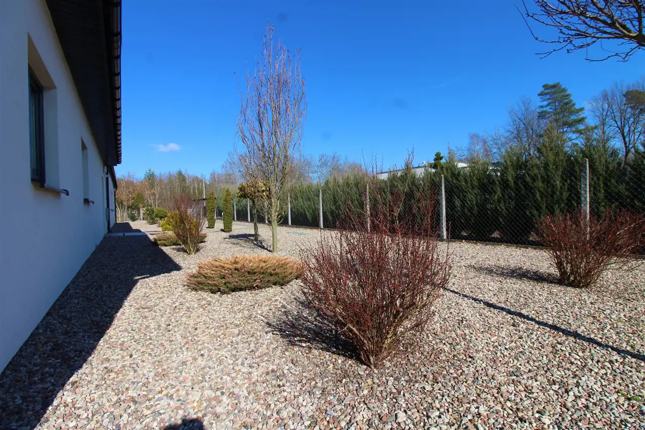 Teren posesji zagospodarowano licznymi krzewami, ozdobnymi nasadzeniami oraz trawą, co czyni prezentowany lokal i jego otoczenie bardziej atrakcyjnymi.