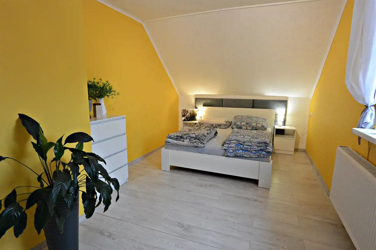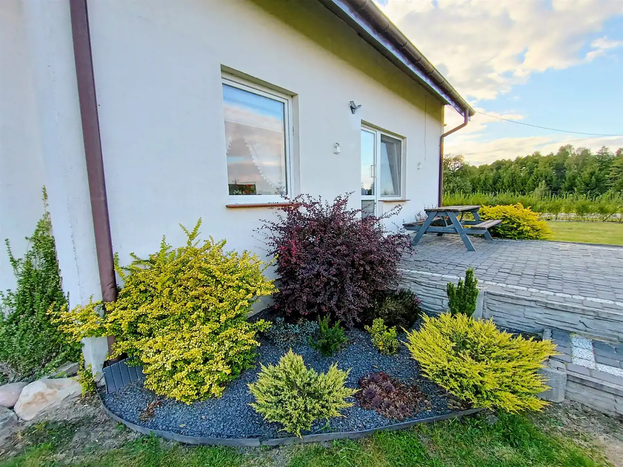 The house is situated on a 2900 m² plot in the shape of a triangle with approximate dimensions: 134 x 142 x 44 [m], frontage width approx. 134 m, in a quiet setting of single-family development and green areas. Construction began in 2004 and was completed in 2010. The building includes an attached single-car garage. Access to the property via a national asphalt road.