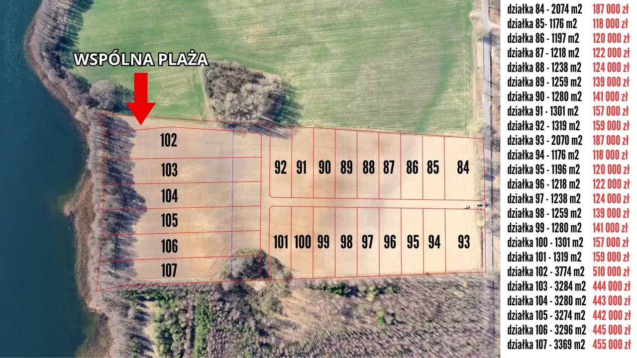 Powierzchnie działek wynoszą od 1176 m2 do 3774 m2. Działki o numerach ewidencyjnych od 102 do 107 posiadają własne linie brzegowe jeziora, zaś pozostałe działki posiadają dostęp do jeziora poprzez wspólną plażę o długości linii brzegowej 20.67 m. Linia zabudowy zgodnie z MPZP zaznaczona jest na mapie niebieską linią.