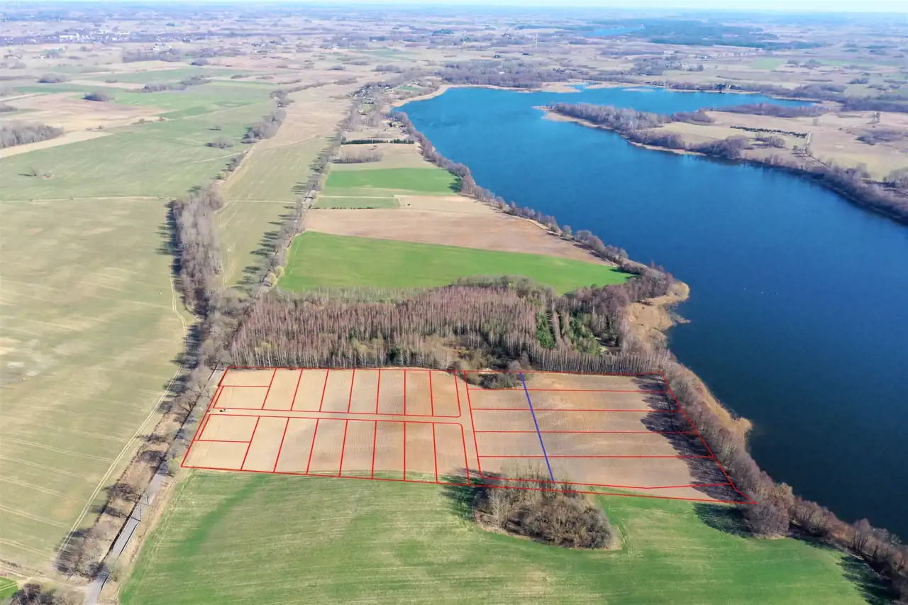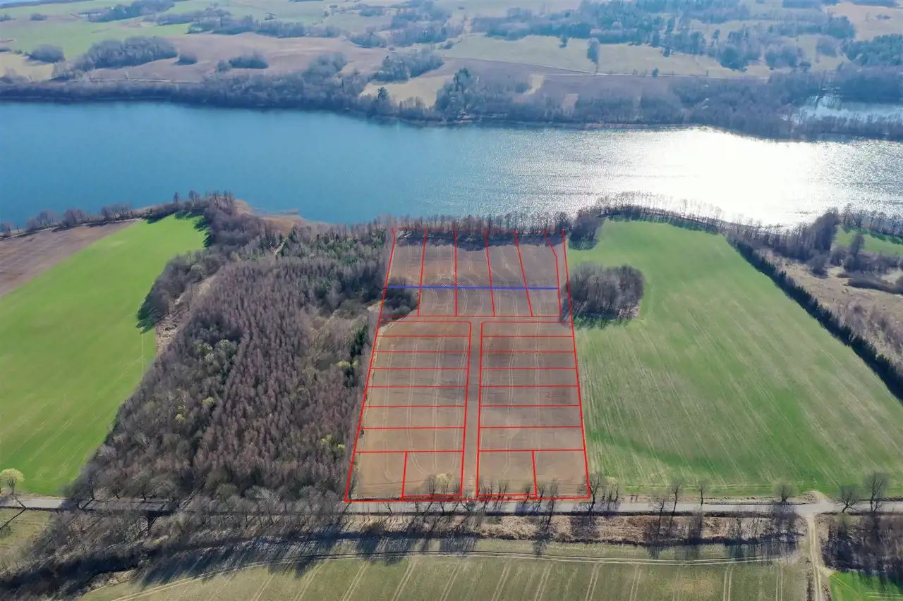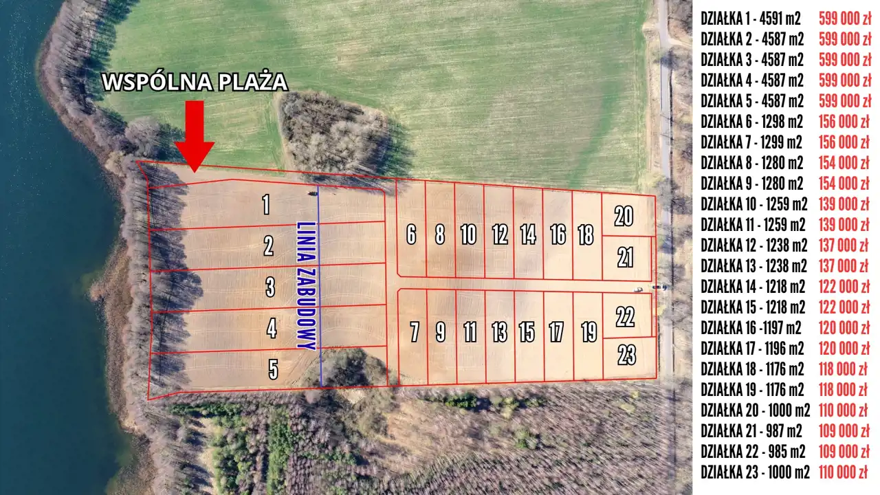 Powierzchnie działek wynoszą od 985 m2 do 4591 m2. Działki o numerach od 1 do 5 posiadają własne linie brzegowe jeziora, zaś pozostałe działki posiadają dostęp do jeziora poprzez wspólną plażę o długości linii brzegowej 20.67 m. Linia zabudowy zgodnie z MPZP zaznaczona jest na mapie niebieską linią.