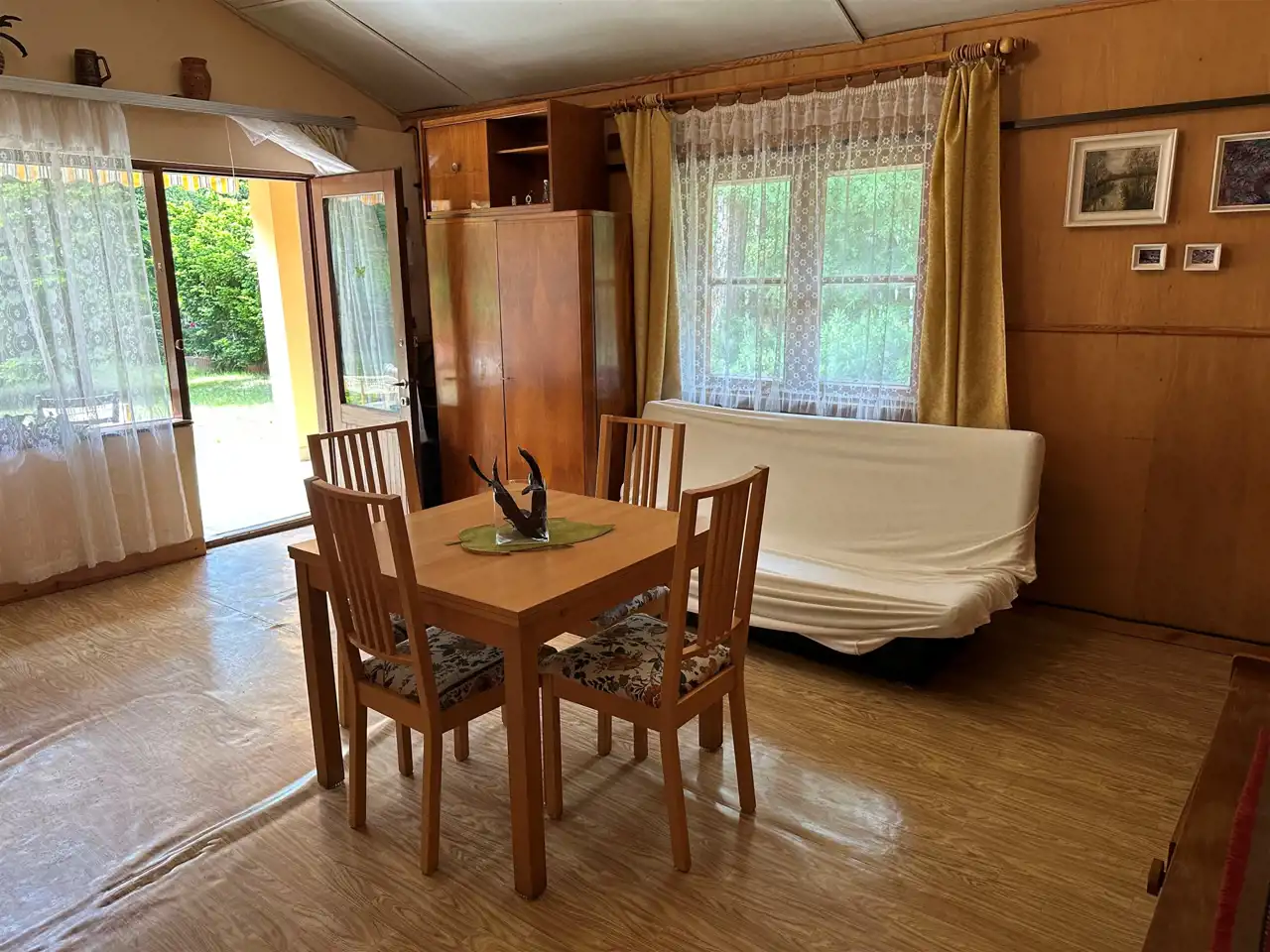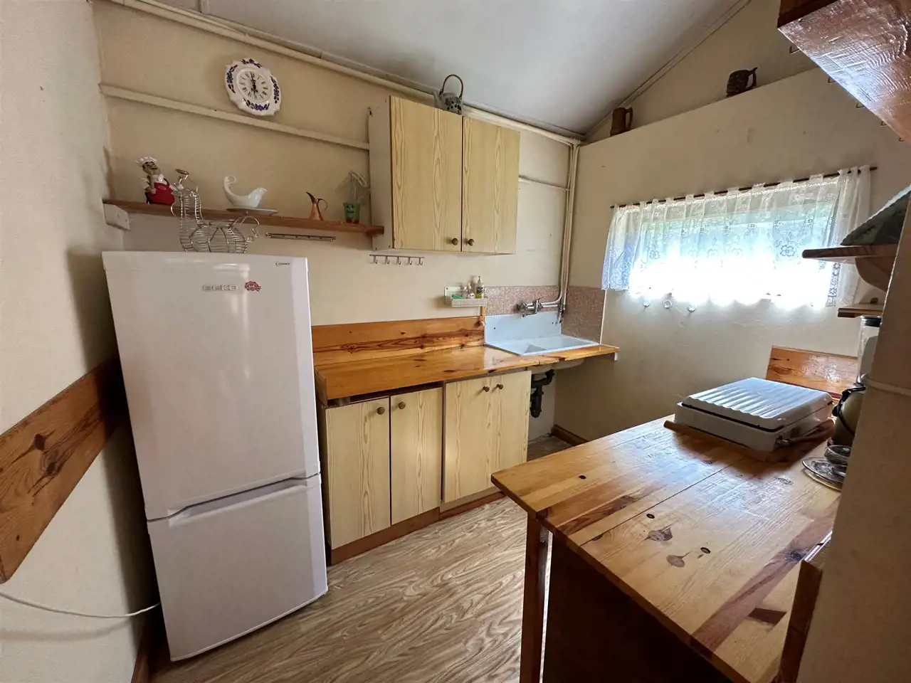 Na działce znajduje się przytulny domek o powierzchni 35 mkw, który składa się z salonu z aneksem sypialnym, kuchni oraz łazienki z prysznicem. W kuchni korzystamy z gazu z butli gazowej. Działka posiada dostęp do prądu, wody oraz szamba. Domek murowany, do odświeżenia. Nowa instalacja hydrauliczna.