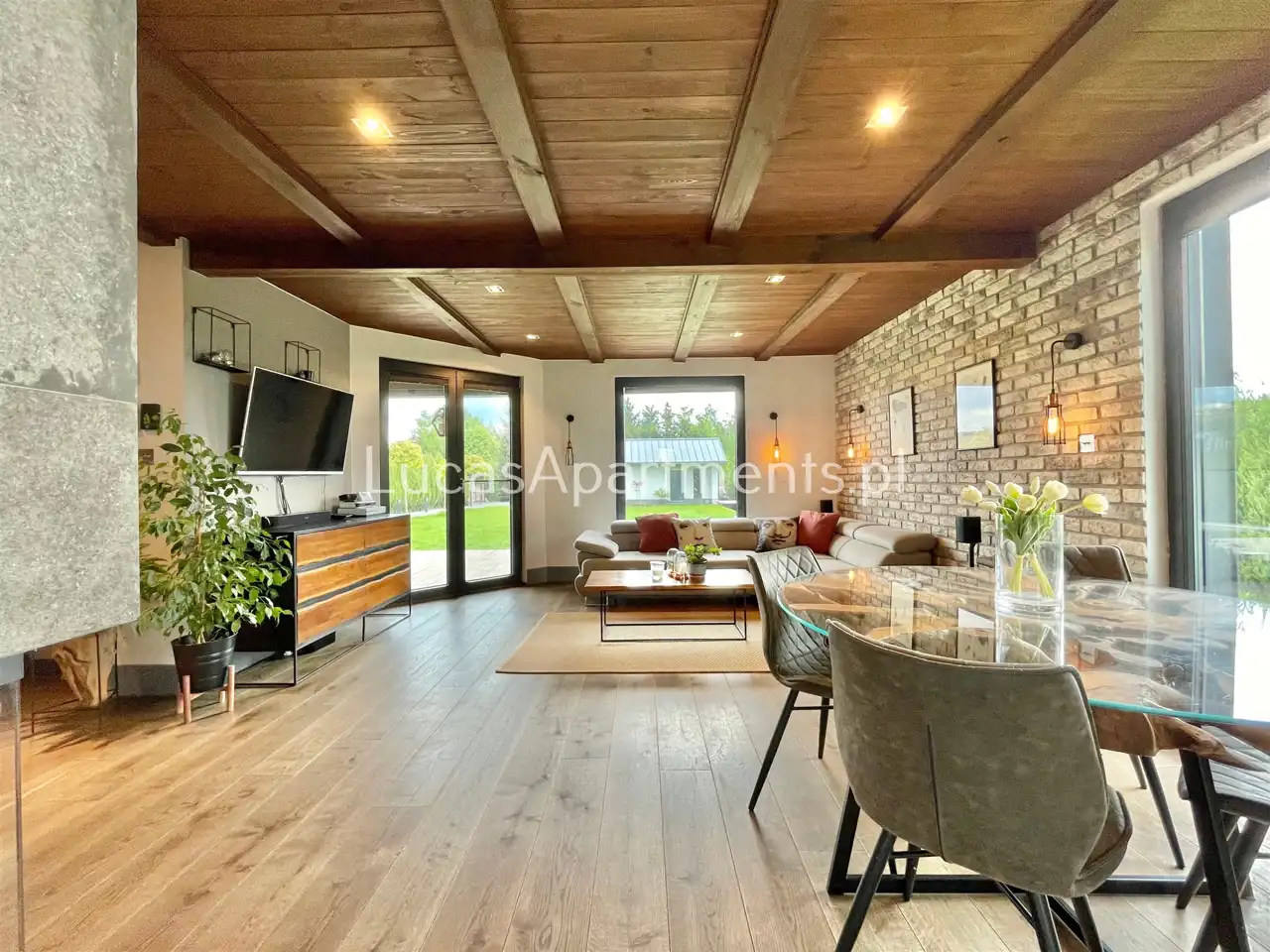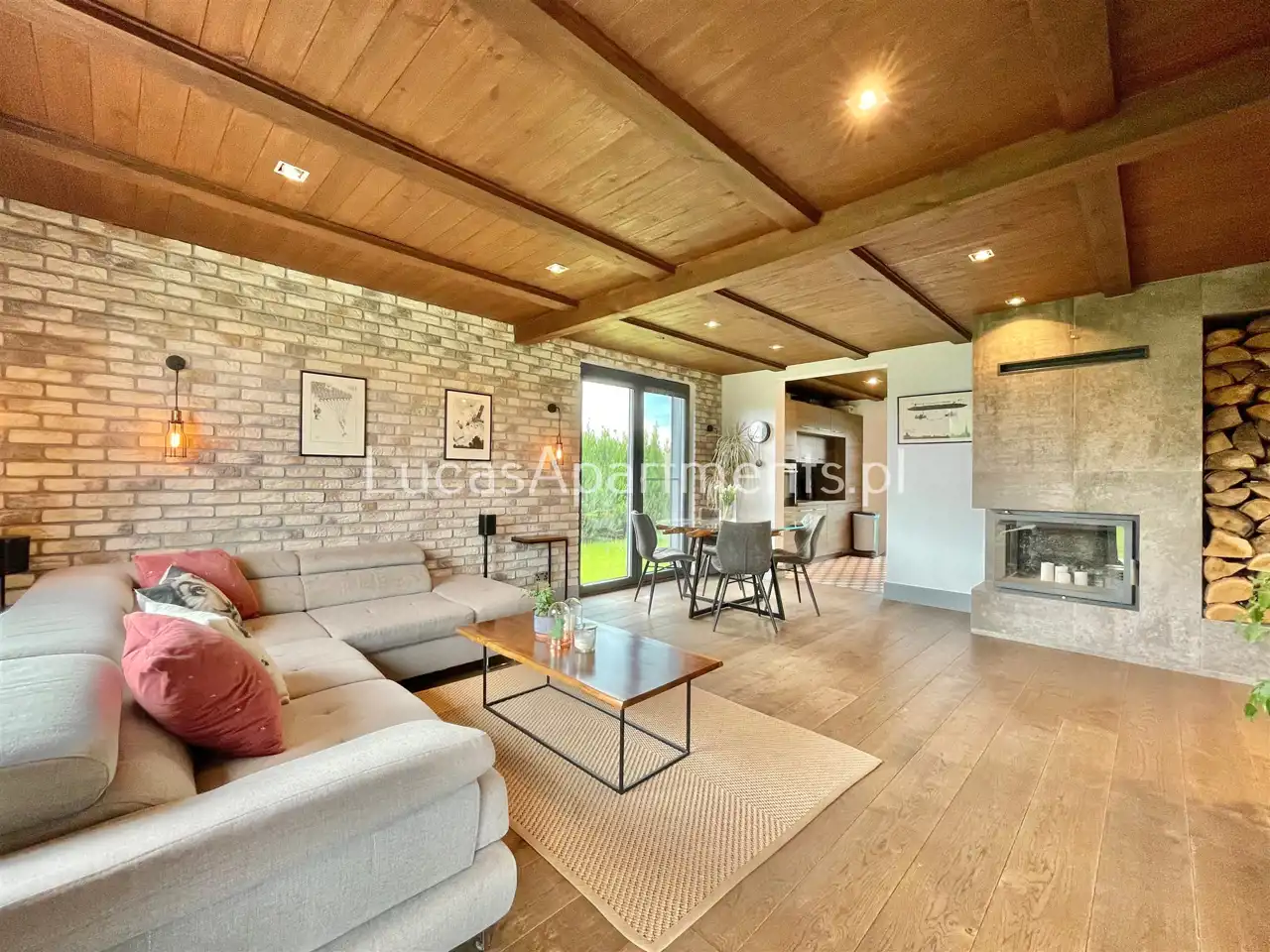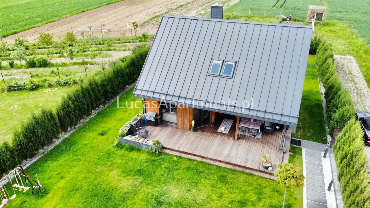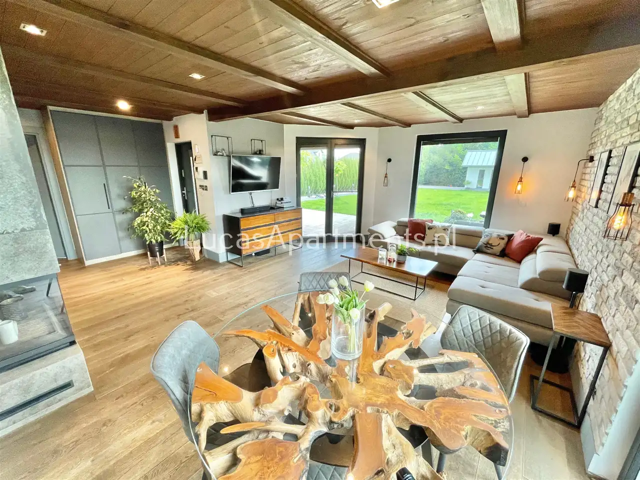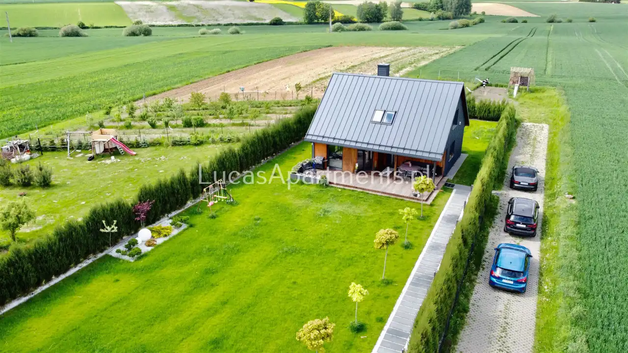 Rok budowy 2015. Dom o konstrukcji szkieletowej, pasywny, charakteryzuje się niskimi kosztami utrzymania. Ogrzewanie własne gazowe zasilane ze zbiornika LPG o pojemności 2700 litrów. Woda ciepła z pieca gazowego 2-funkcyjnego. W salonie znajduj się kominek z płaszczem wodnym. Okna PCV firmy Salamander. Zainstalowany alarm z czujnikami ruchu. Na tarasie zainstalowane automatyczne żaluzje przeciwsłoneczne. Powierzchnia tarasu przed domem około 40 m2.