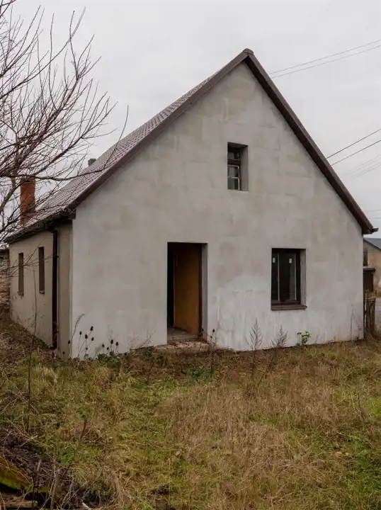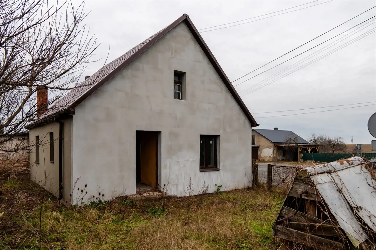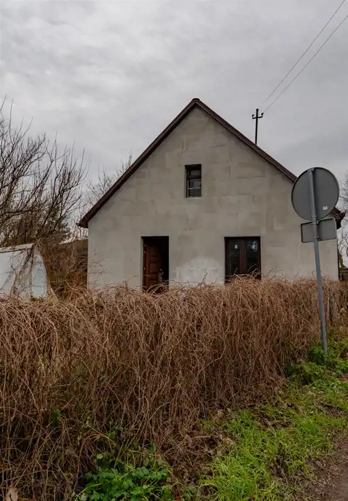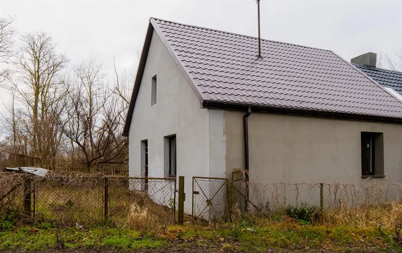 Dom jest częściowo wyremontowany – z zewnątrz cały budynek został docieplony styropianem i zagruntowany, na dachu położono nową membranę wraz z blacho-dachówką.