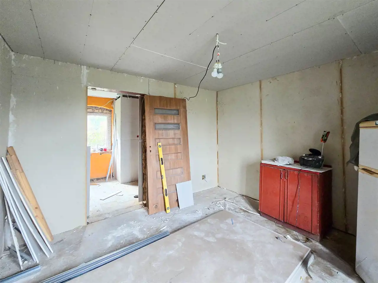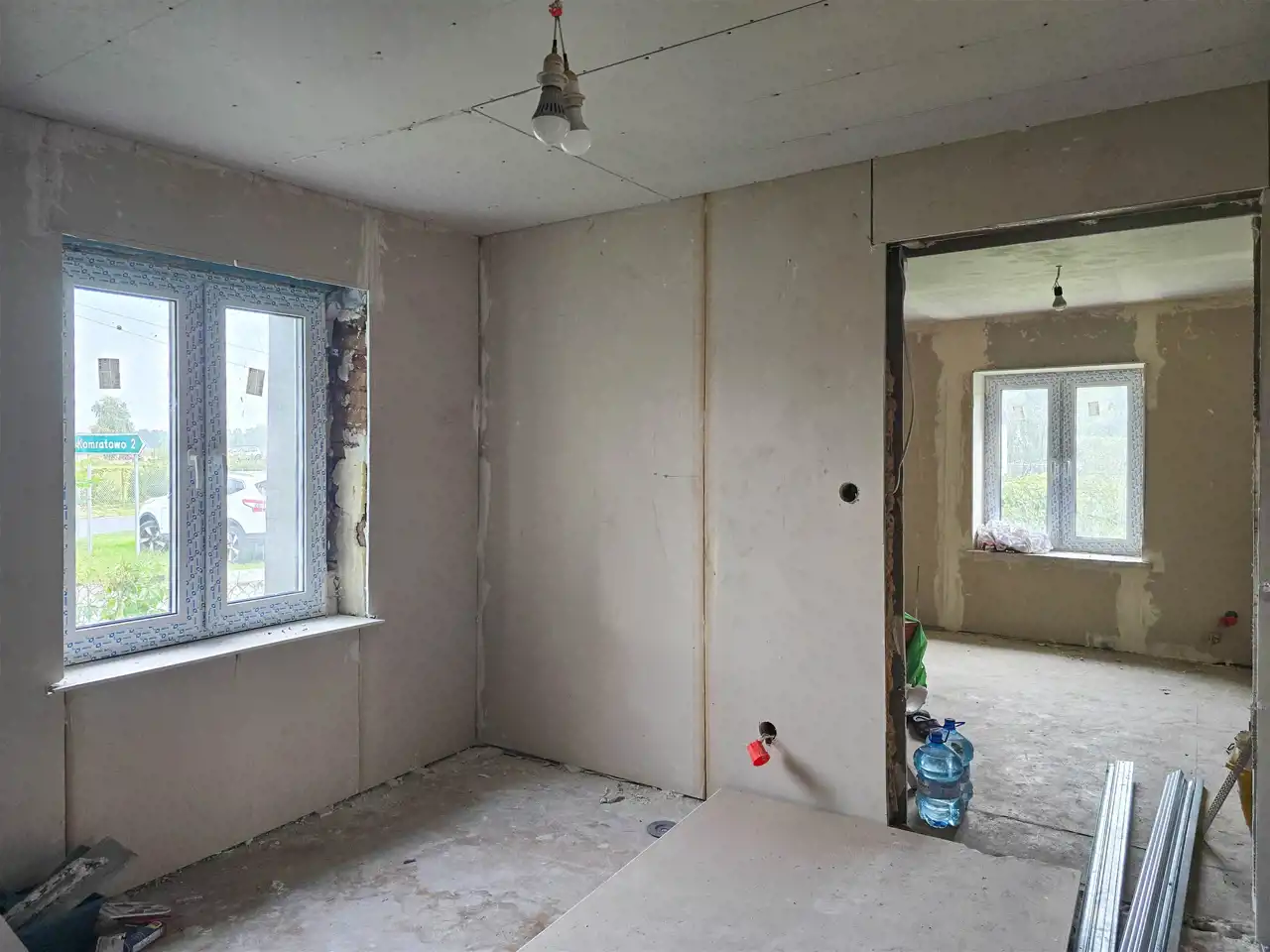 W cenie nieruchomości jest również komplet płyt karton-gips, które wystarczą na pokrycie całej przestrzeni wewnątrz budynku, a także grzejniki oraz piec gazowy.