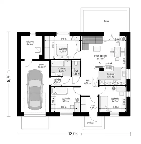 Funkcjonalny układ obejmuje przestronny salon o pow. 21,38 m² z aneksem kuchennym 6,14 m², trzy ustawne sypialnie (11,01 m², 9,93 m², 9,47 m²), łazienkę, osobne WC, kotłownię oraz garaż 18,93 m². Projekt wyróżnia wyraźny podział na strefę dzienną i nocną, co zapewnia wygodę codziennego użytkowania.