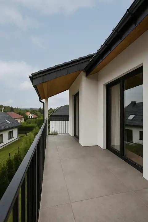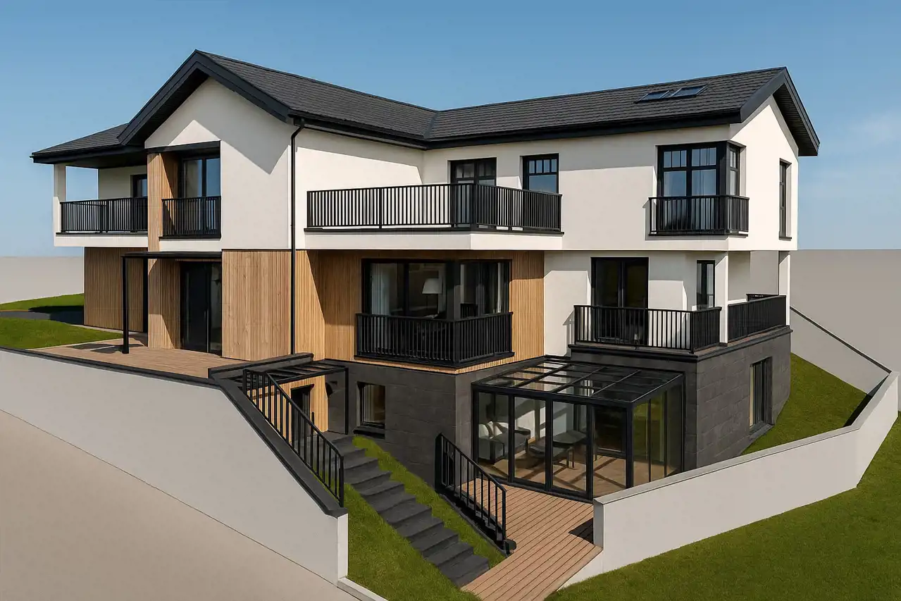 Large windows, terraces, and a modern design integrated into the natural slope of the terrain give the development a unique character.