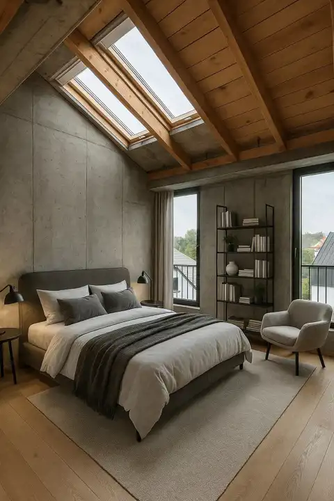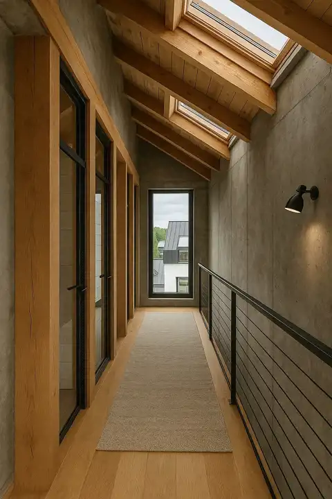 - Piętro: 3 sypialnie, łazienka, garderoba, antresola z biblioteką.