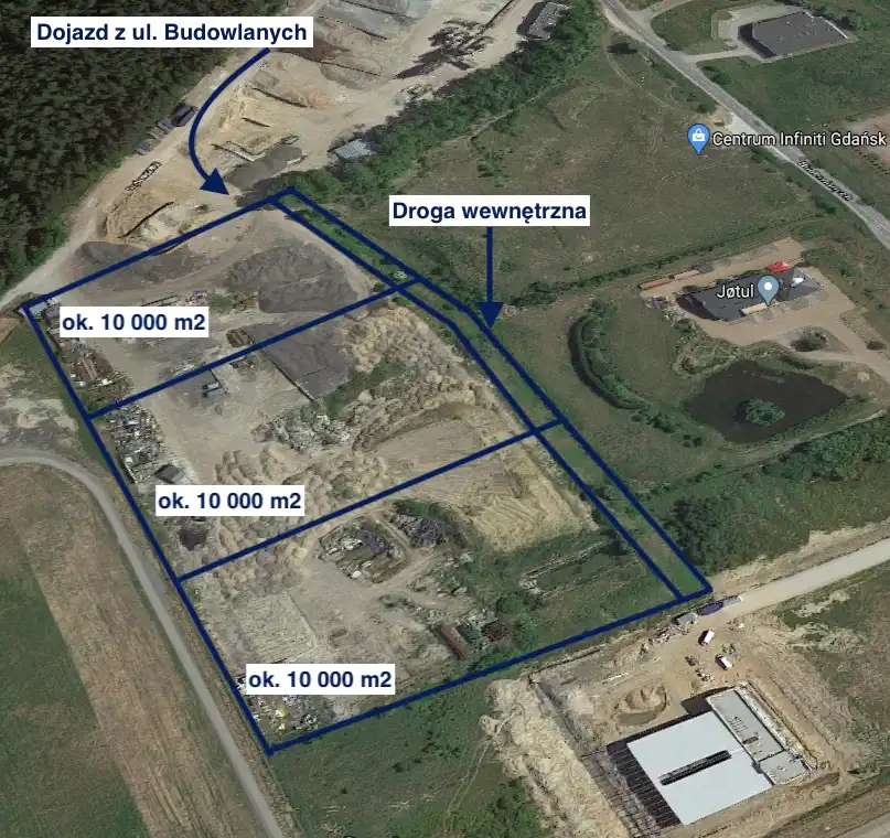 Lokalizacja oferuje dostęp do węzła obwodnicy trójmiejskiej (1 min), centrum (8 min) i lotniska (5 min). Działka jest położona przy asfaltowej drodze głównej. Otoczenie stanowią budynki biurowo-magazynowe. Dzięki atutom lokalizacji działalność jest skoncentrowana na szybkości działania, transportu, dostępności dla klientów. Sąsiedztwo jest bazą dla licznych inwestycji, co również przekłada się na wartość gruntu i rozwój infrastruktury.