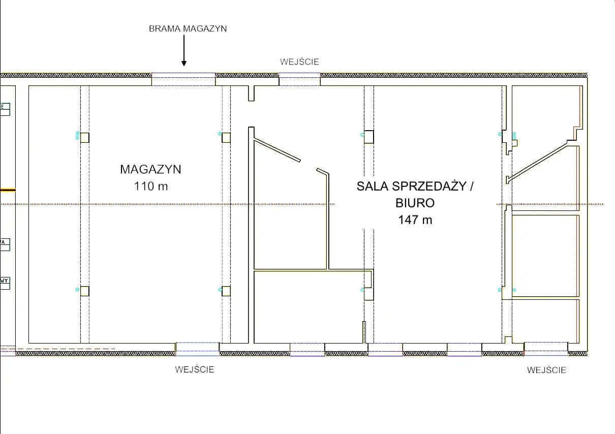 Magazyn z niezależnym wejściem oraz bramą. Dwa niezależne wejścia do powierzchni biurowo / sprzedażowej.
