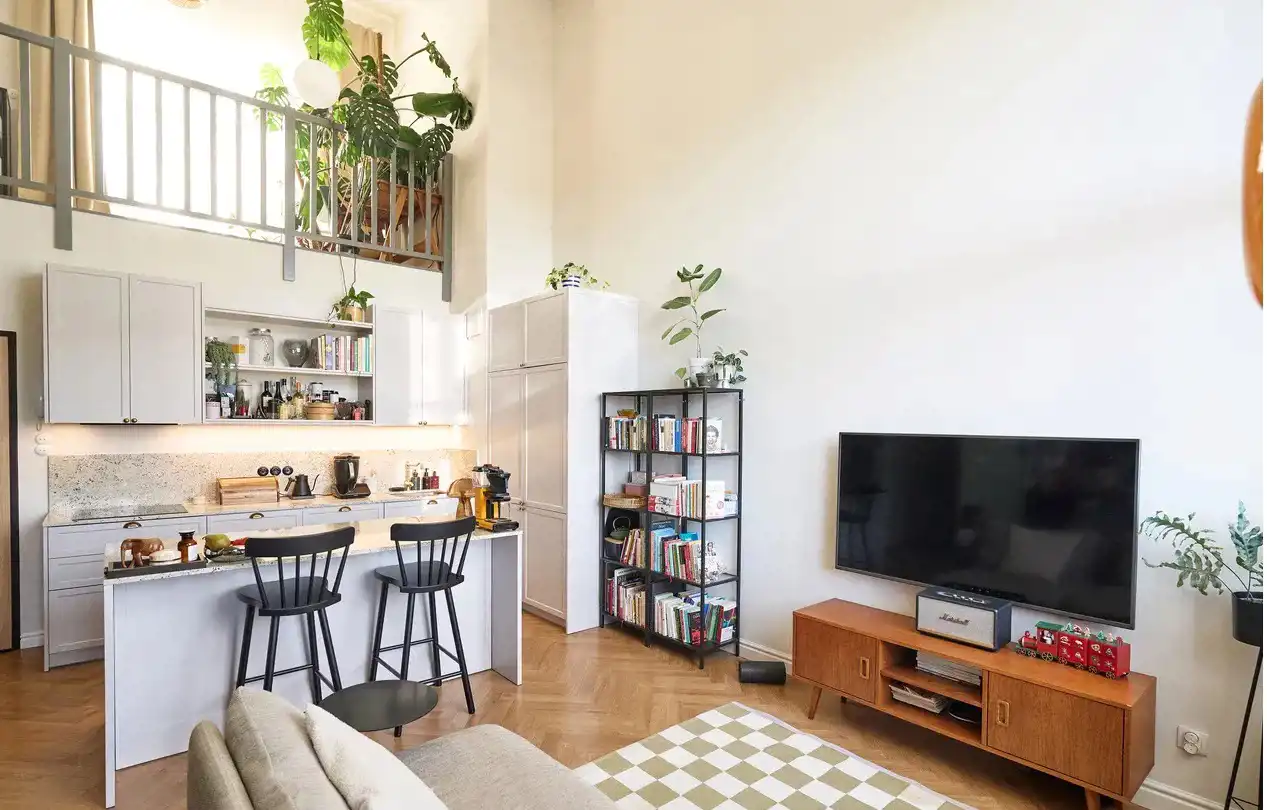To dwupoziomowe mieszkanie typu loft charakteryzuje się:
