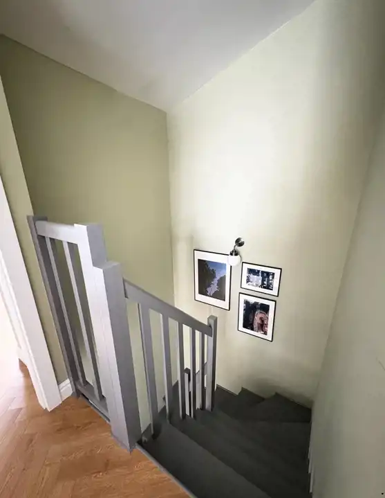 - Custom-made wooden stairs with a practical storage area