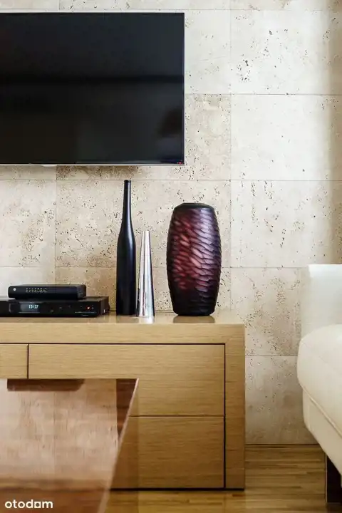 Na powierzchnię użytkową składają się: salon z aneksem kuchennym i wyjściem na balkon, sypialnia, dwa inne pokoje/sypialnie z zabudowanymi szafami, funkcjonalna łazienka główna z wysokiej jakości prysznicem oraz zabudowaną pralką i suszarką, druga łazienka dla gości, przedpokój z trzymetrową zabudowaną szafą. Apartament wyposażony w meble robione na wymiar. Uwagę zwracają liczne elementy wykonane z egzotycznego drewna.