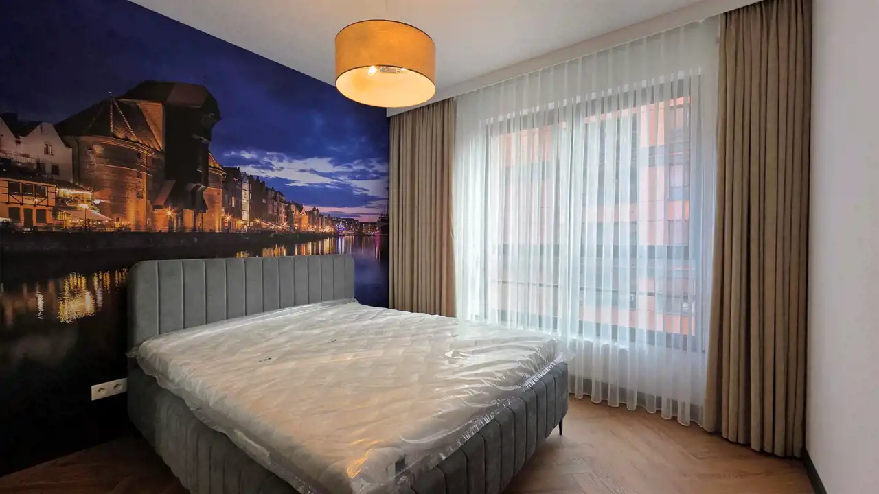 Elegancko zaprojektowane wnętrze, wysoka jakość wykończenia oraz doskonała lokalizacja w pobliżu Starego Miasta sprawiają, że jest to idealne miejsce do komfortowego życia w jednej z najbardziej atrakcyjnych części miasta. Dwupokojowe mieszkanie o powierzchni 47,27 m2, składa się z salonu z aneksem kuchennym, sypialni, przedpokoju, łazienki z WC oraz balkonu. Nieruchomość została zaaranżowana w bardzo praktyczny sposób, a wykończenie pomieszczeń daje poczucie świeżości i estetyki. Serce nieruchomości stanowi jasny salon z aneksem kuchennym w zabudowie. W kuchni znalazł miejsce niezbędny sprzęt: zmywarka Electrolux, płyta indukcyjna i piekarnik elektryczny Hisense, lodówko - zamrażarka Haier, oraz pochłaniacz. Ściany pomieszczeń pokryto gładzią oraz jasnymi farbami, ( w sypialni na jednej ze ścian fototapeta z krajobrazem Gdańska), a podłogę panelami podłogowymi w kolorze jasnego dębu.