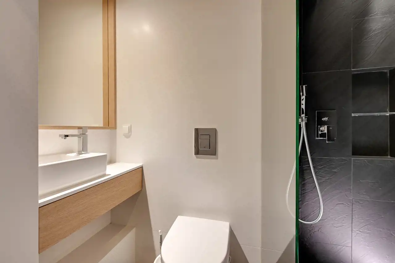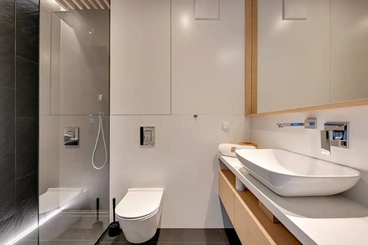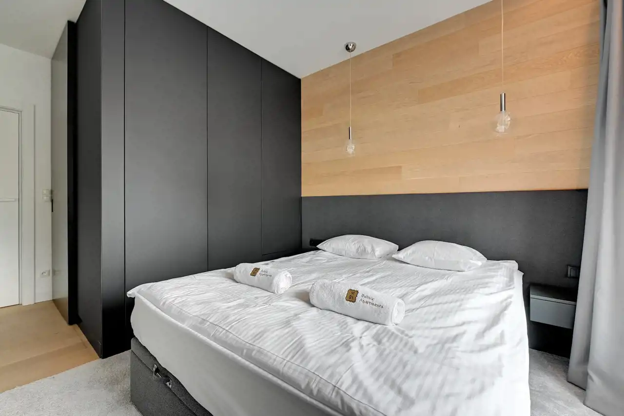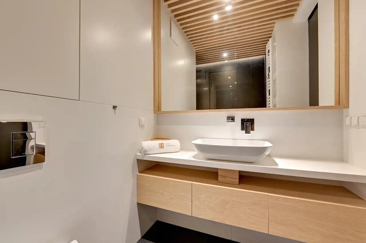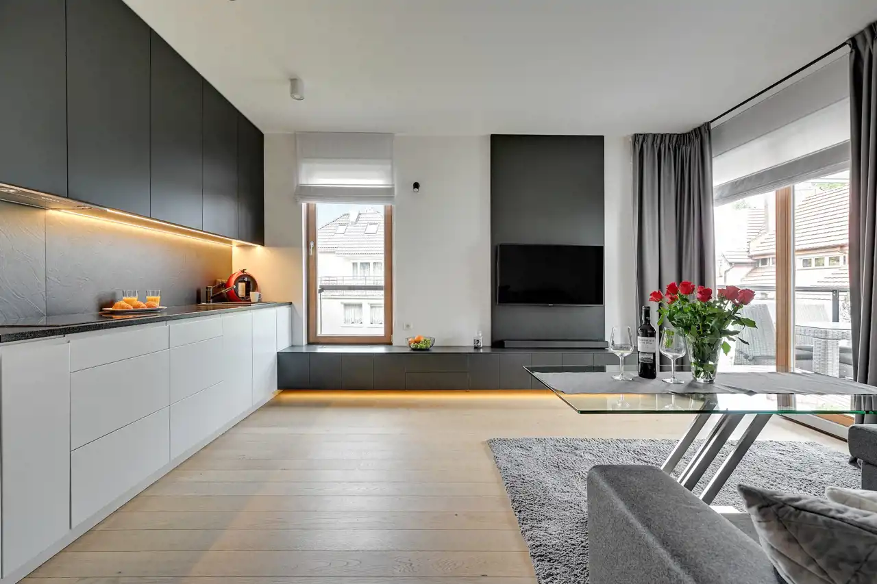 Cały apartament został wykończony ze smakiem z bardzo wysokiej jakości materiałów pod okiem architekta wnętrz.