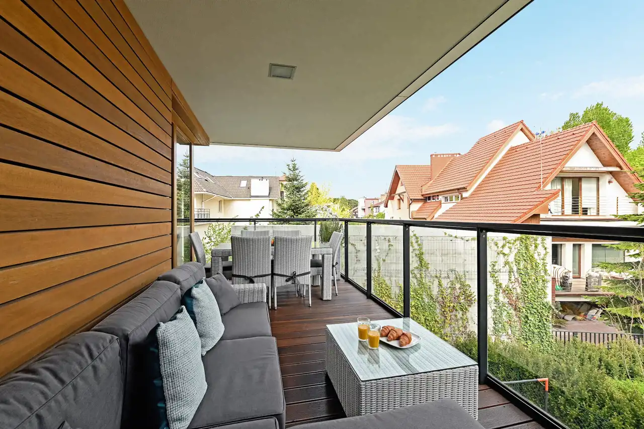- salonu z wyjściem na przestronny 14m2 taras z widokiem na zieleń