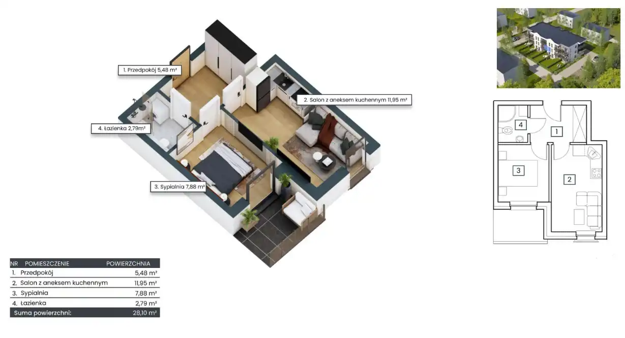 - Charakterystyka mieszkania 28.1 m2, 2 pokoje