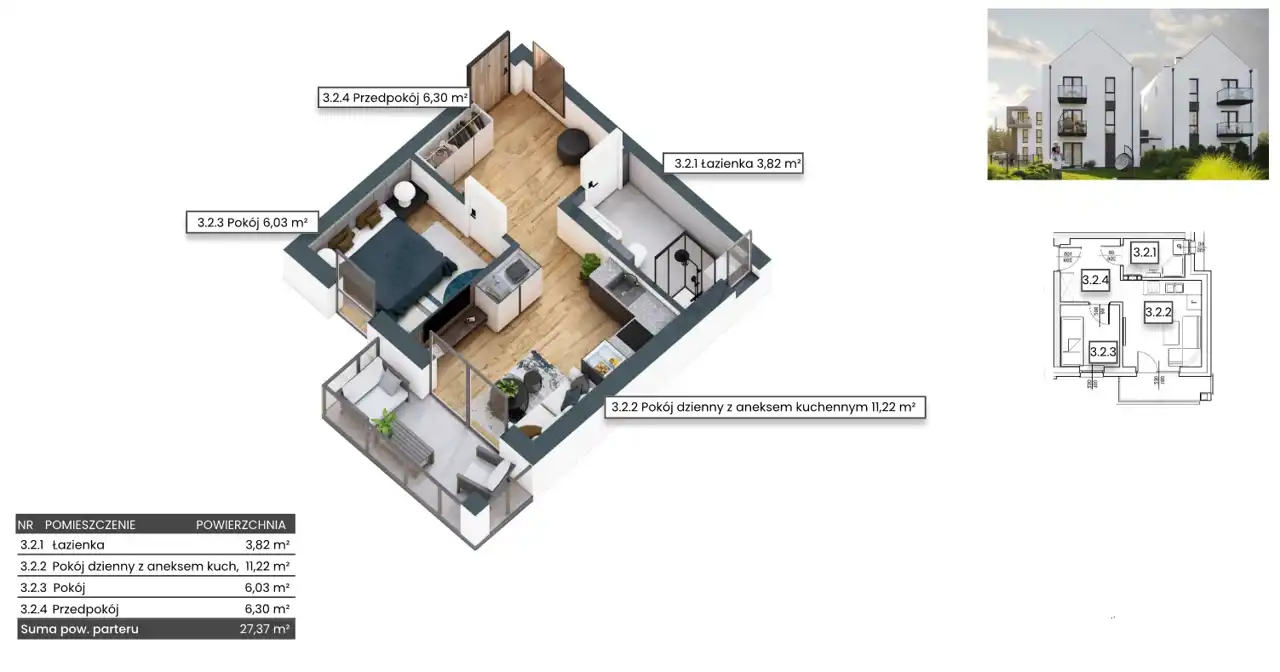 - Charakterystyka mieszkania 27.37 m2, 2 pokoje