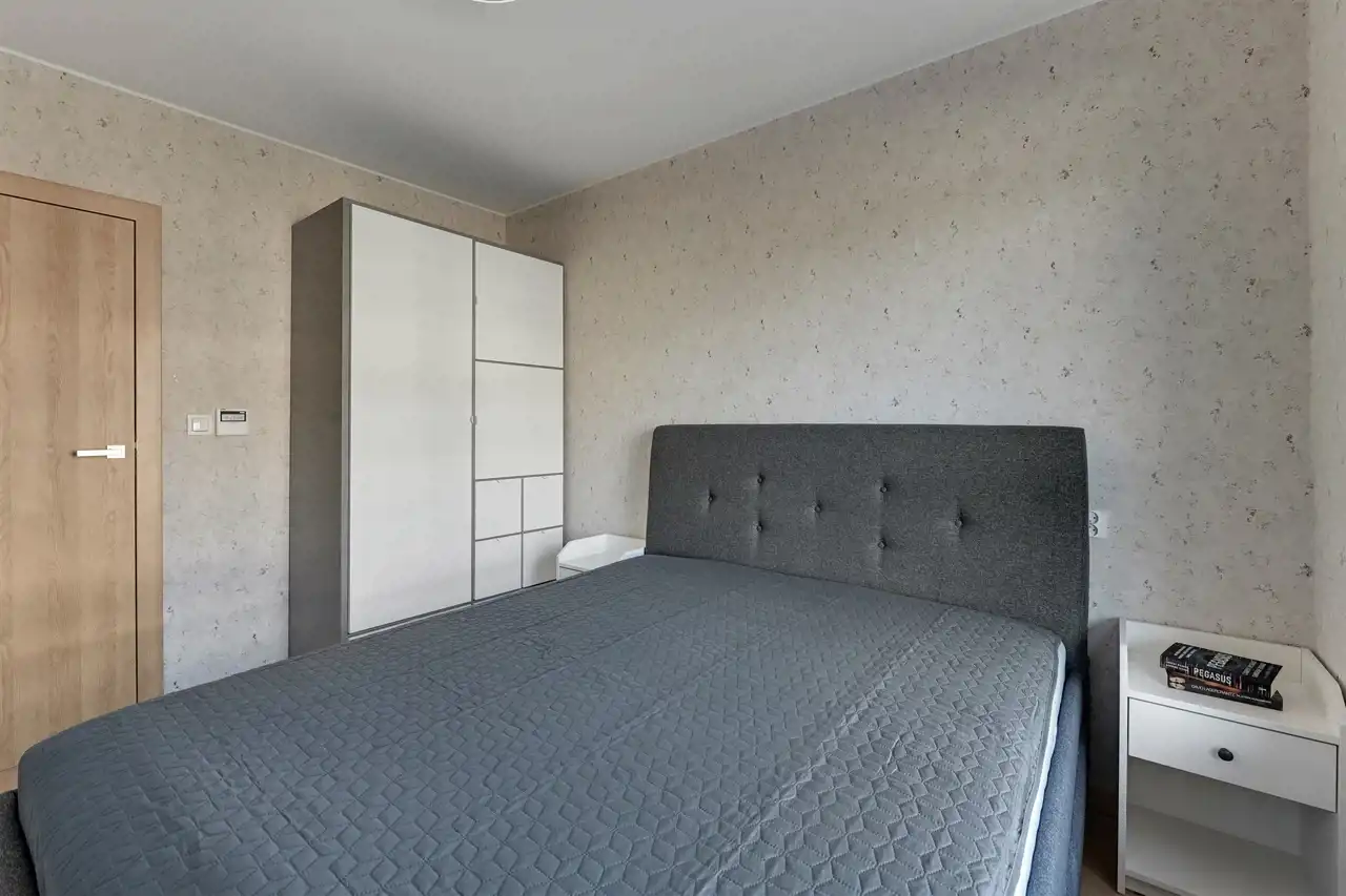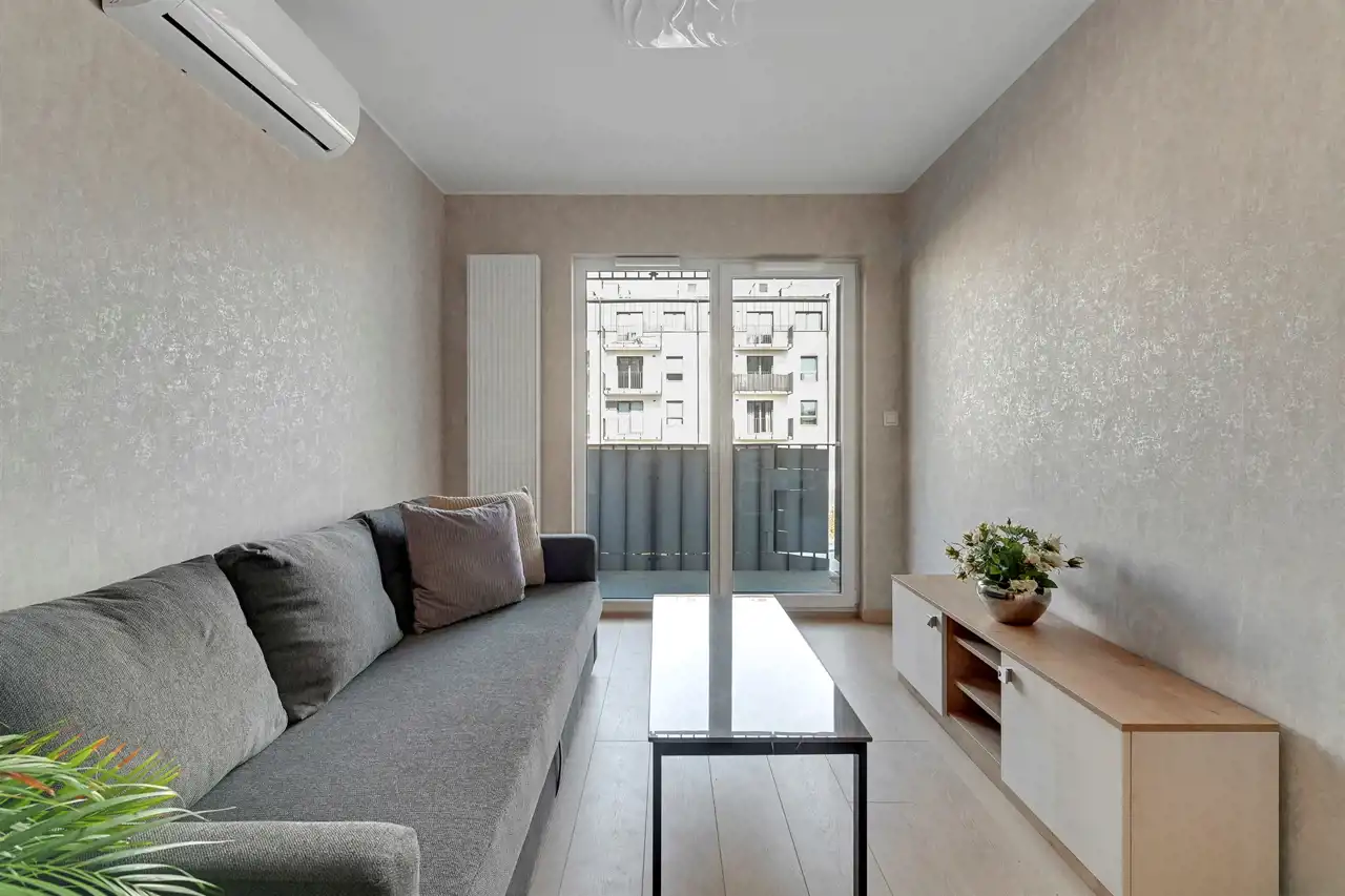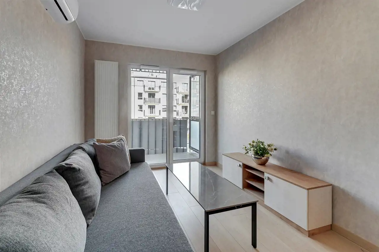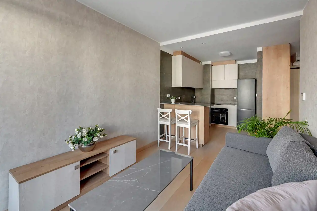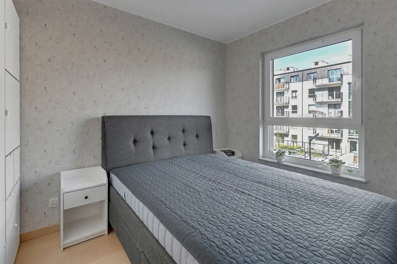 Przestronne, dwupokojowe mieszkanie znajdujące się na drugim piętrze budynku. Lokal posiada klimatyzację. Pomieszczenia są bardzo jasne i ustawne. Część dzienna z bezpośrednim wyjściem na balkon połączona została aneksem w zabudowie. W salonie stolik kawowy, stylowa sofa oraz szafka RTV (brak telewizora). Strefa kuchenna wyposażona w niezbędny sprzęt AGD, bardzo funkcjonalna, dużo miejsca do przechowywania i blatu roboczego. Przedpokój oferuje dużą, funkcjonalną szafę. W łazience prysznic z deszczownicą, umywalka oraz WC (brak pralki), uroku dodają stylowe kafle. Mieszkanie jest gotowe do wprowadzenia, przestronne i przytulne.