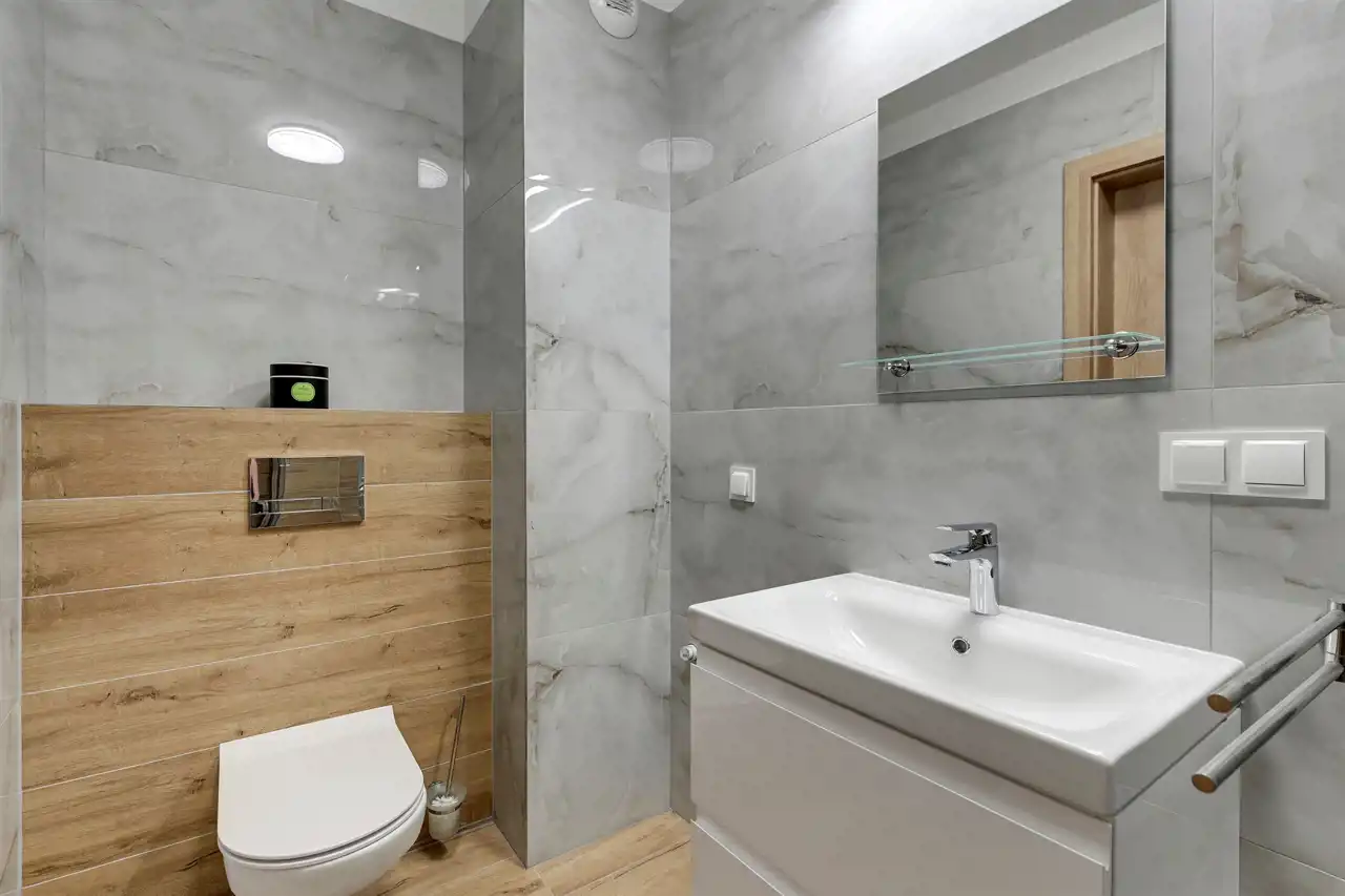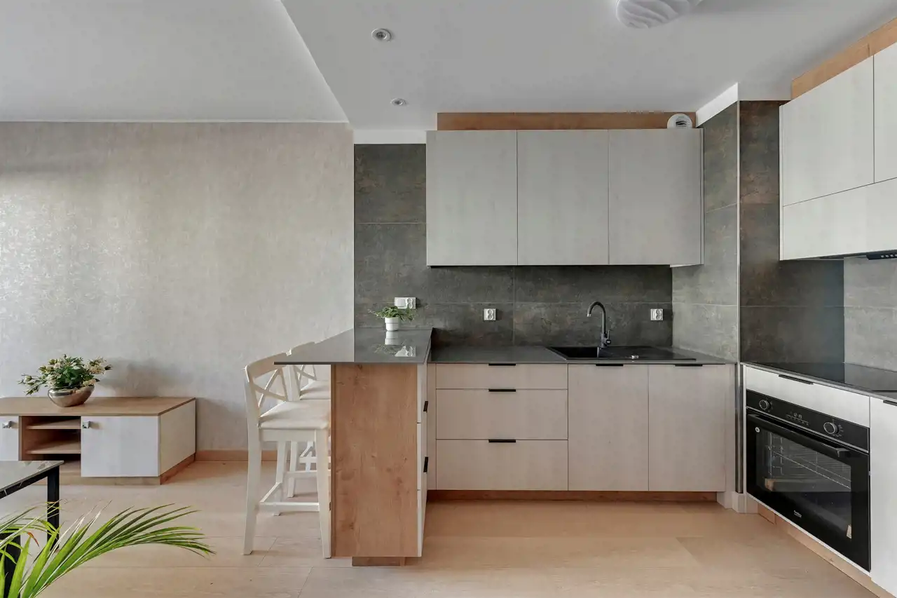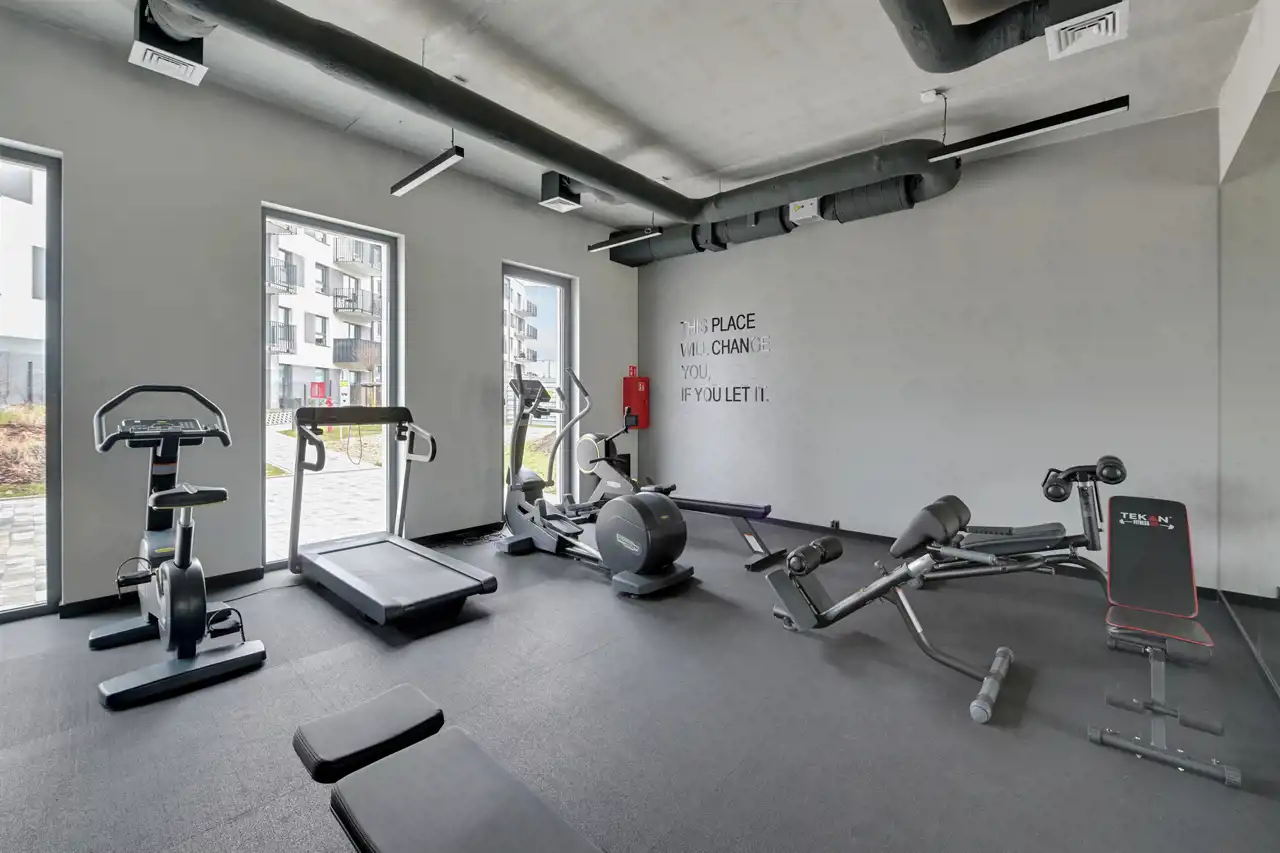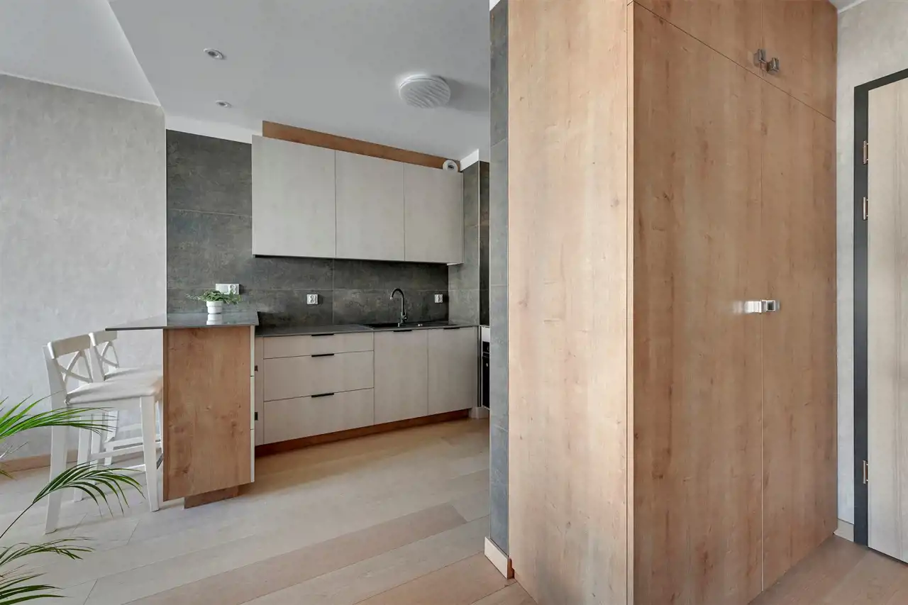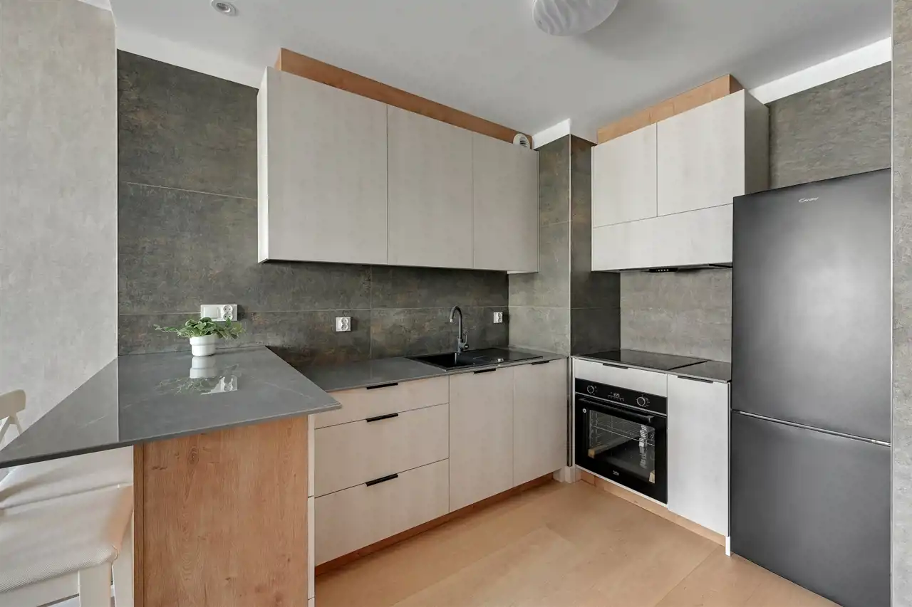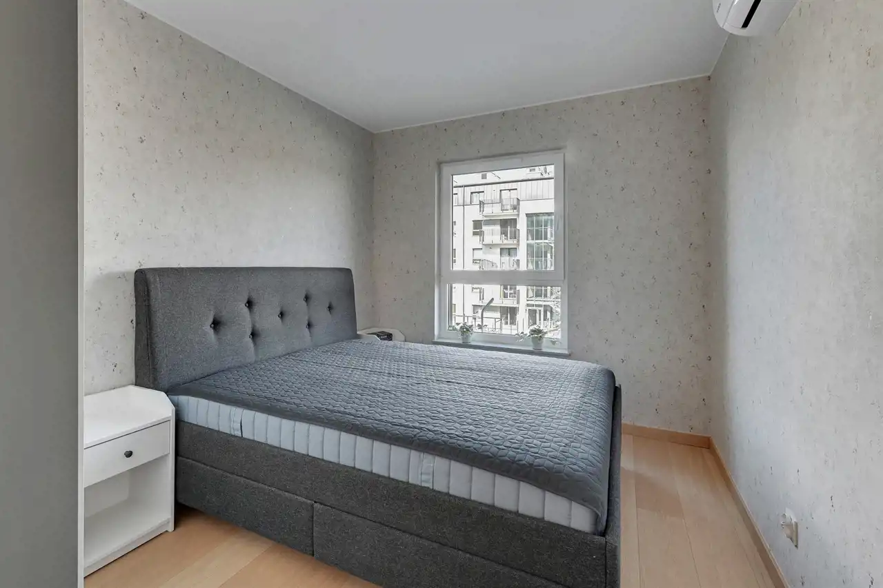 Przestronne, dwupokojowe mieszkanie znajdujące się na drugim piętrze budynku. Lokal posiada klimatyzację. Pomieszczenia są bardzo jasne i ustawne. Część dzienna z bezpośrednim wyjściem na balkon połączona została aneksem w zabudowie. W salonie stolik kawowy, stylowa sofa oraz szafka RTV (brak telewizora). Strefa kuchenna wyposażona w niezbędny sprzęt AGD, bardzo funkcjonalna, dużo miejsca do przechowywania i blatu roboczego. Przedpokój oferuje dużą, funkcjonalną szafę. W łazience prysznic z deszczownicą, umywalka oraz WC (brak pralki), uroku dodają stylowe kafle. Mieszkanie jest gotowe do wprowadzenia, przestronne i przytulne.