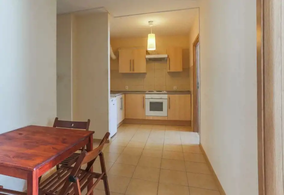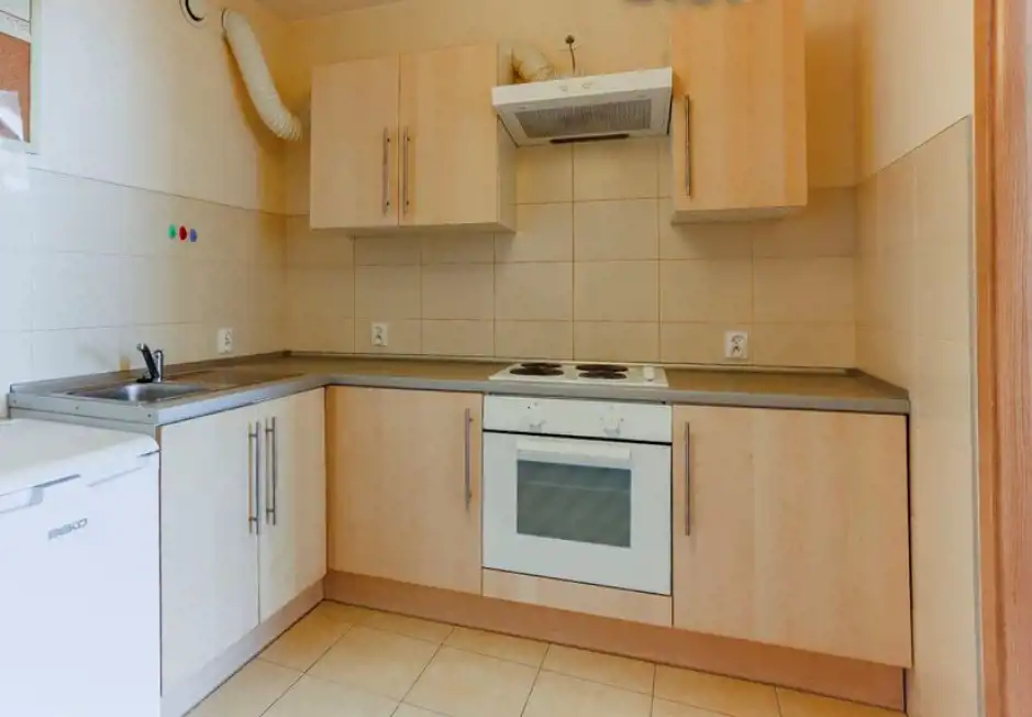 w kuchni znajdziesz lodówkę, płytę grzewczą, piekarnik, stolik i krzesła,