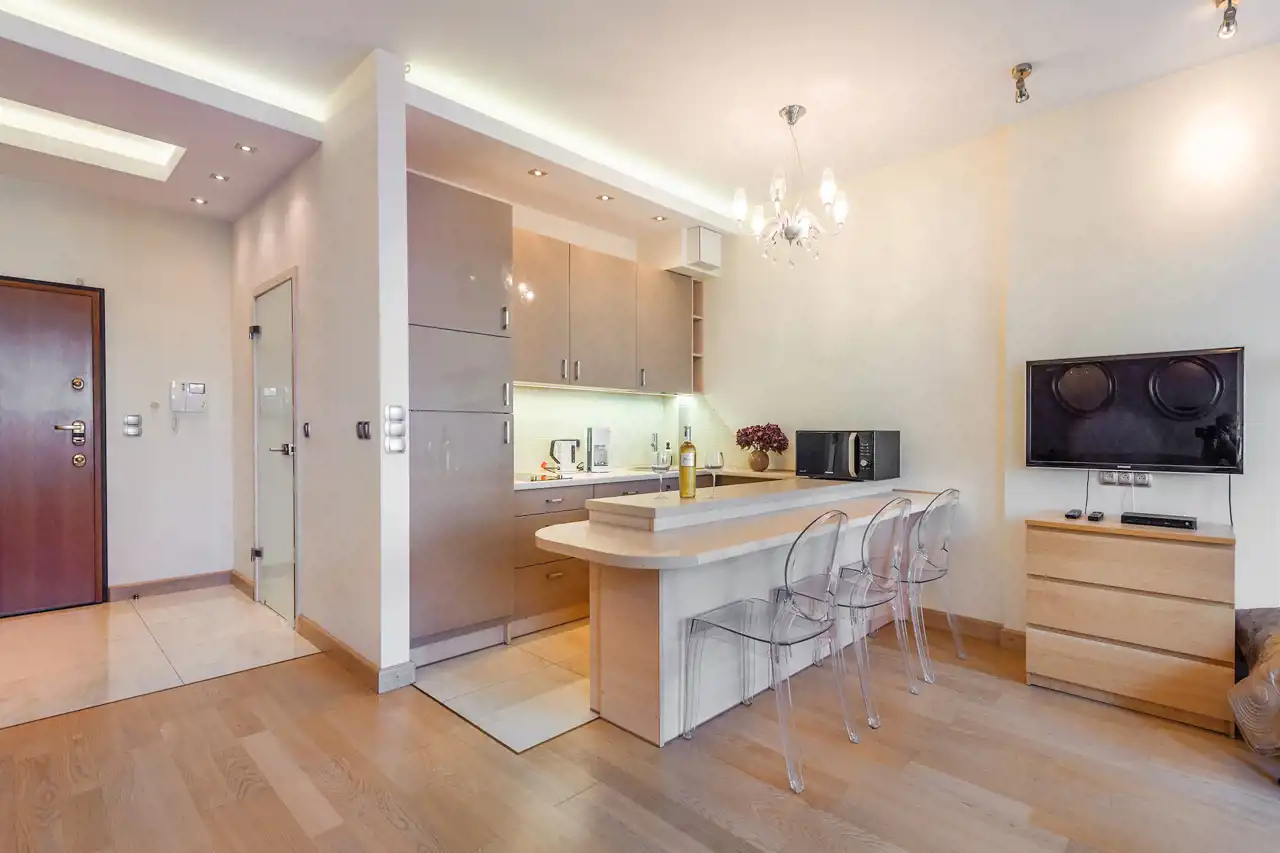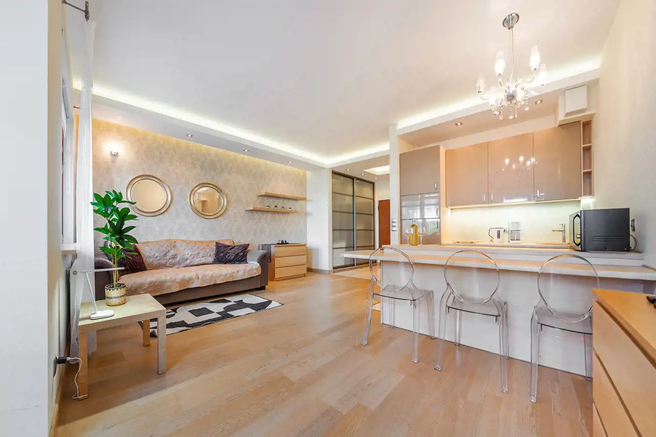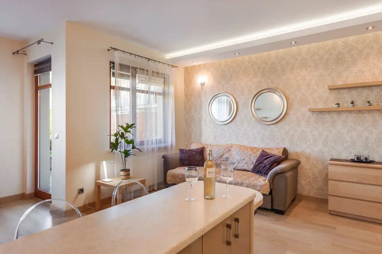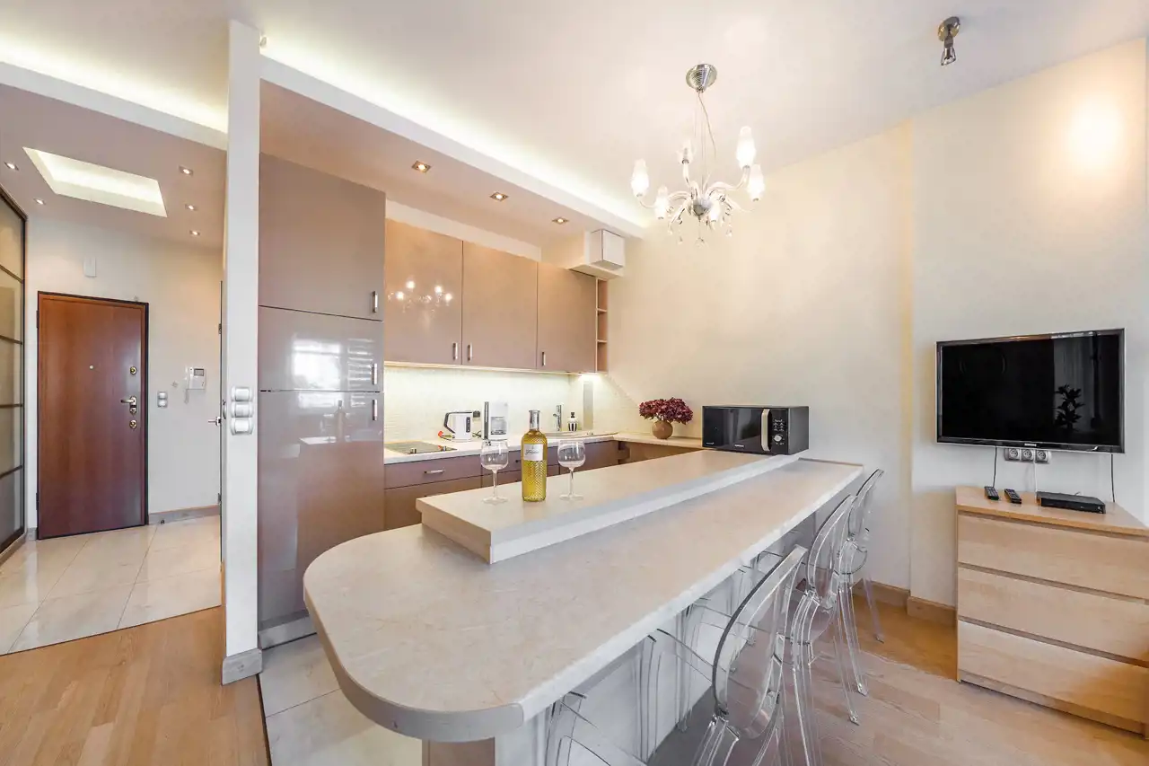 Apartament w pełni umeblowany o wysokim standardzie widocznym na zdjęciach.