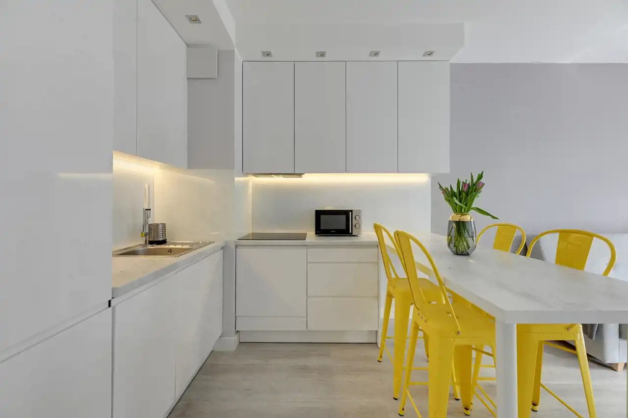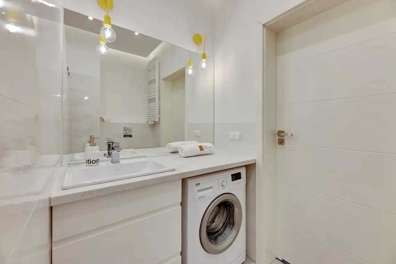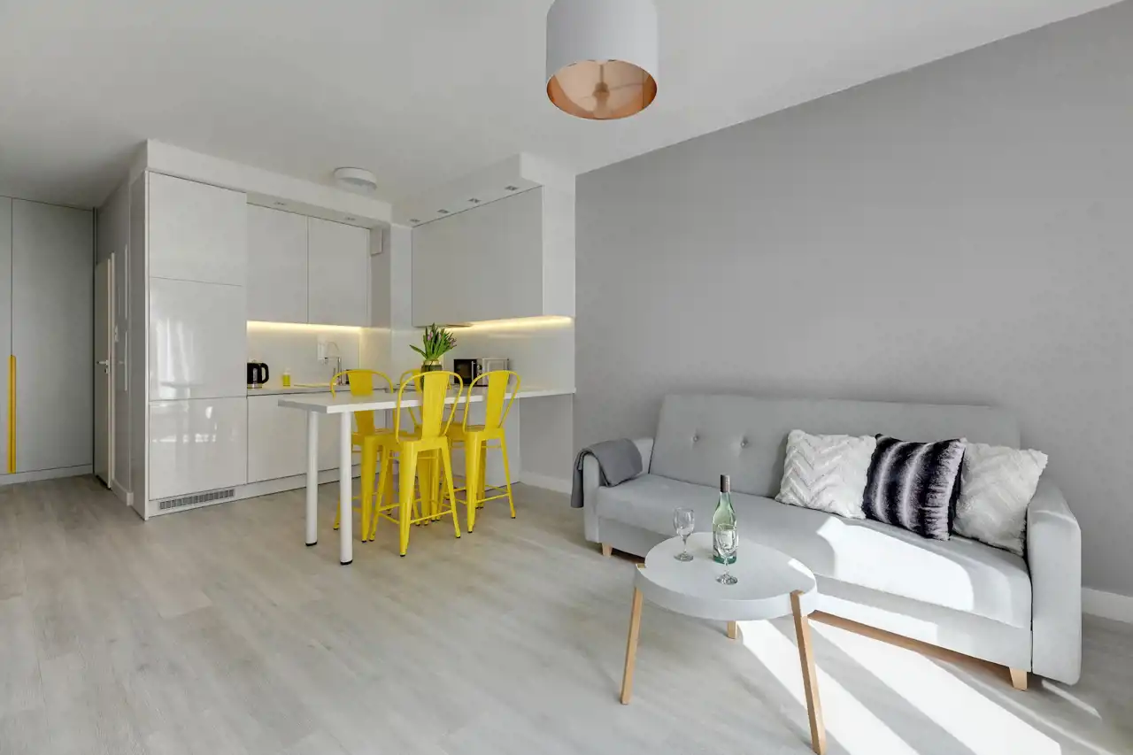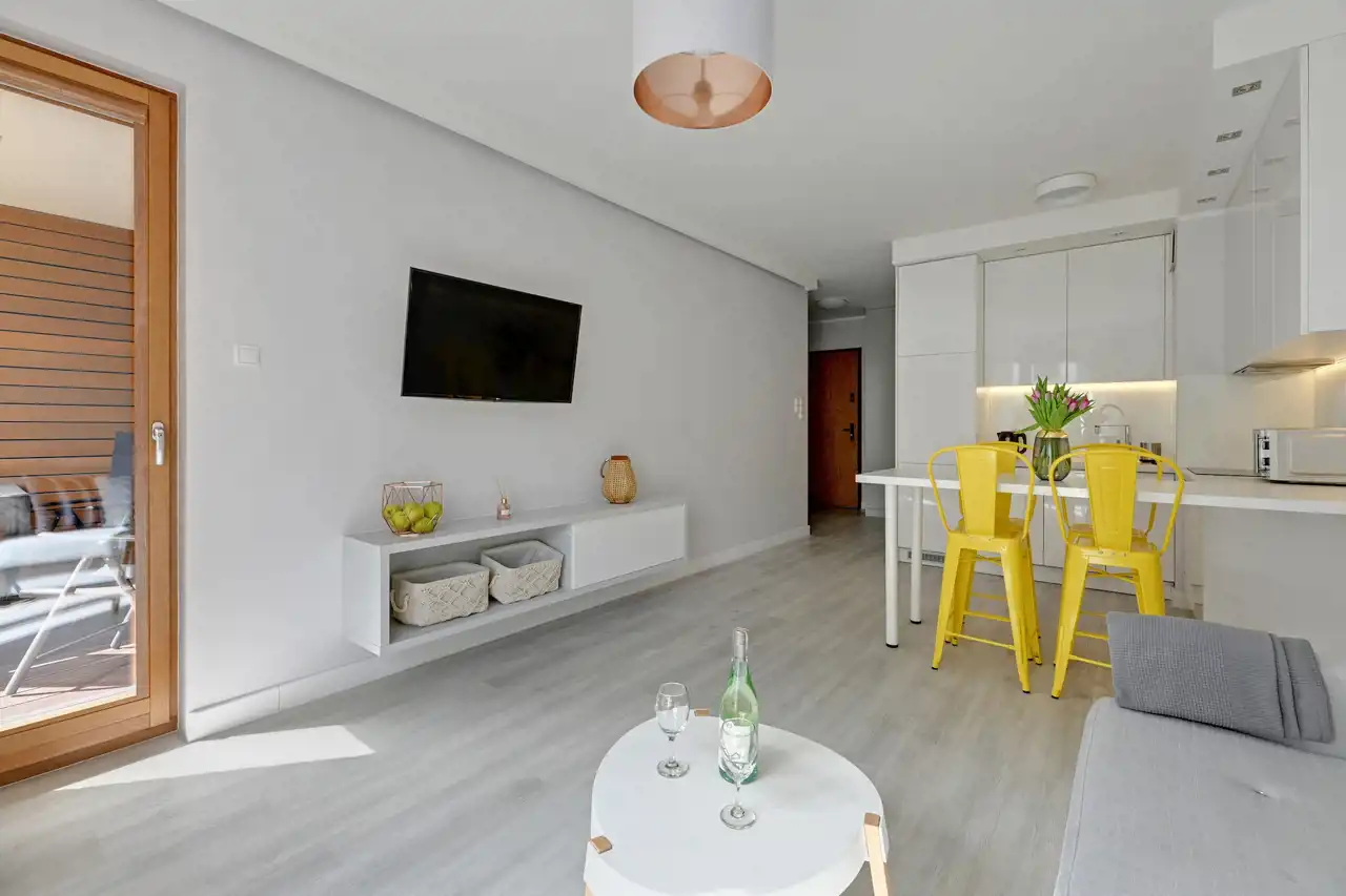 Apartament jest w pełni umeblowany o wysokim standardzie widocznym na zdjęciach.