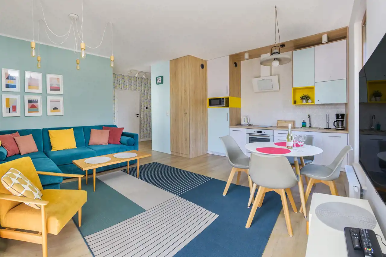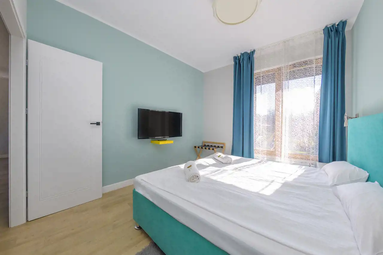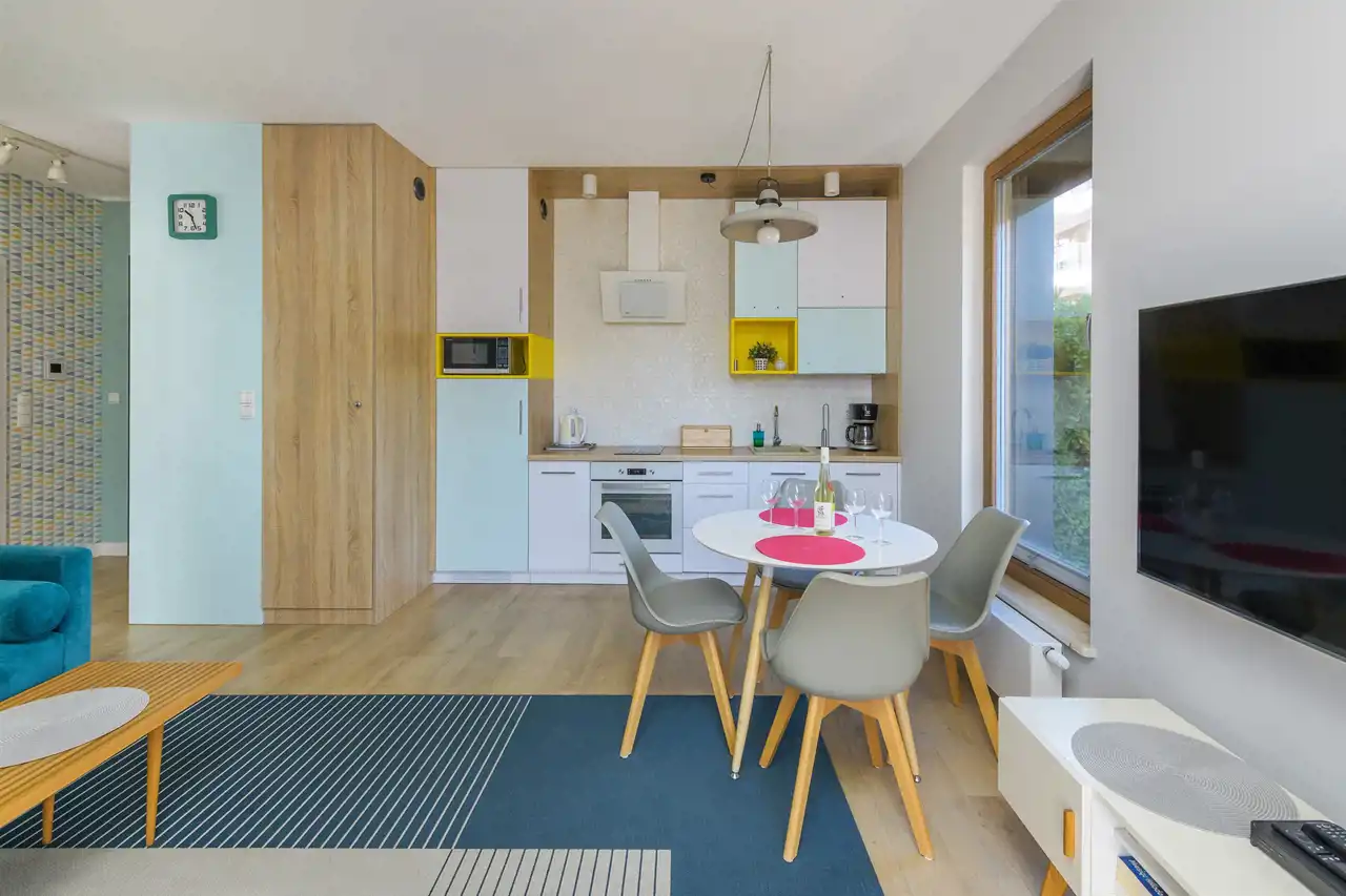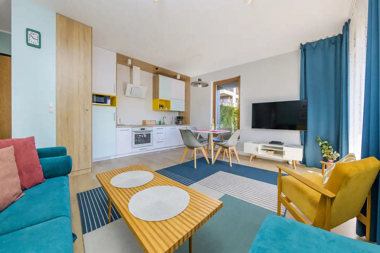 Apartament jest w pełni umeblowany o wysokim standardzie widocznym na zdjęciach.