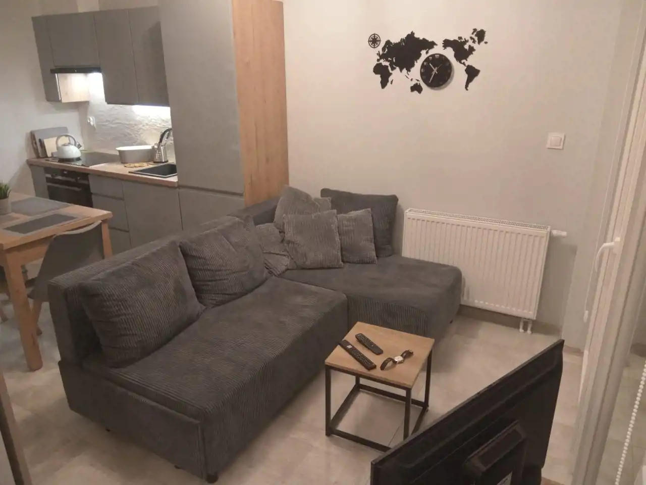 - Salon: Umeblowany, z kanapą narożną, stołem z 4 krzesłami, telewizorem.