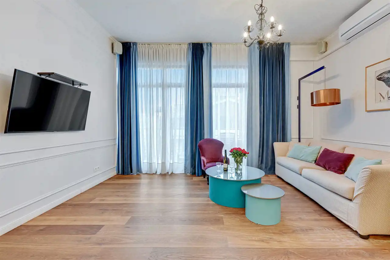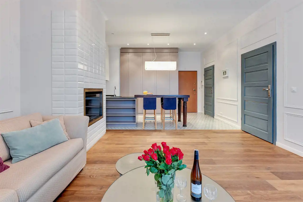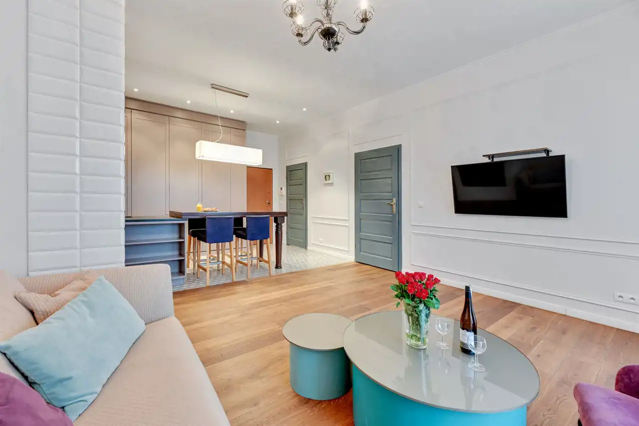 Apartament w pełni umeblowany o wysokim standardzie widocznym na zdjęciach.