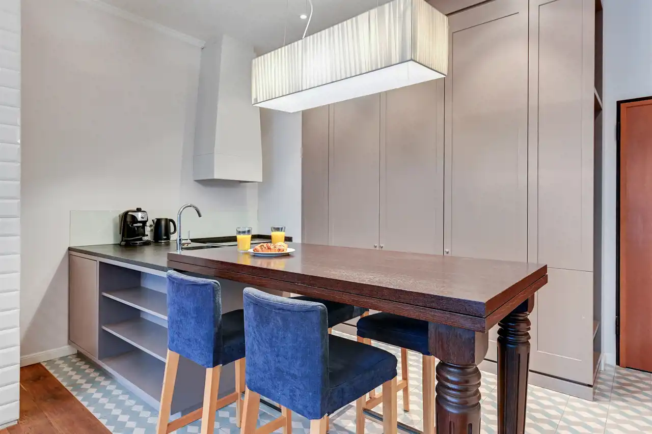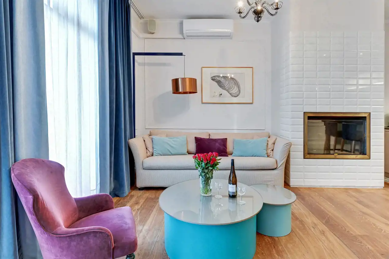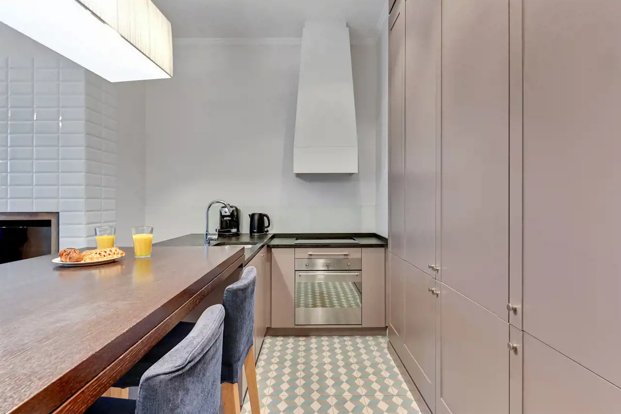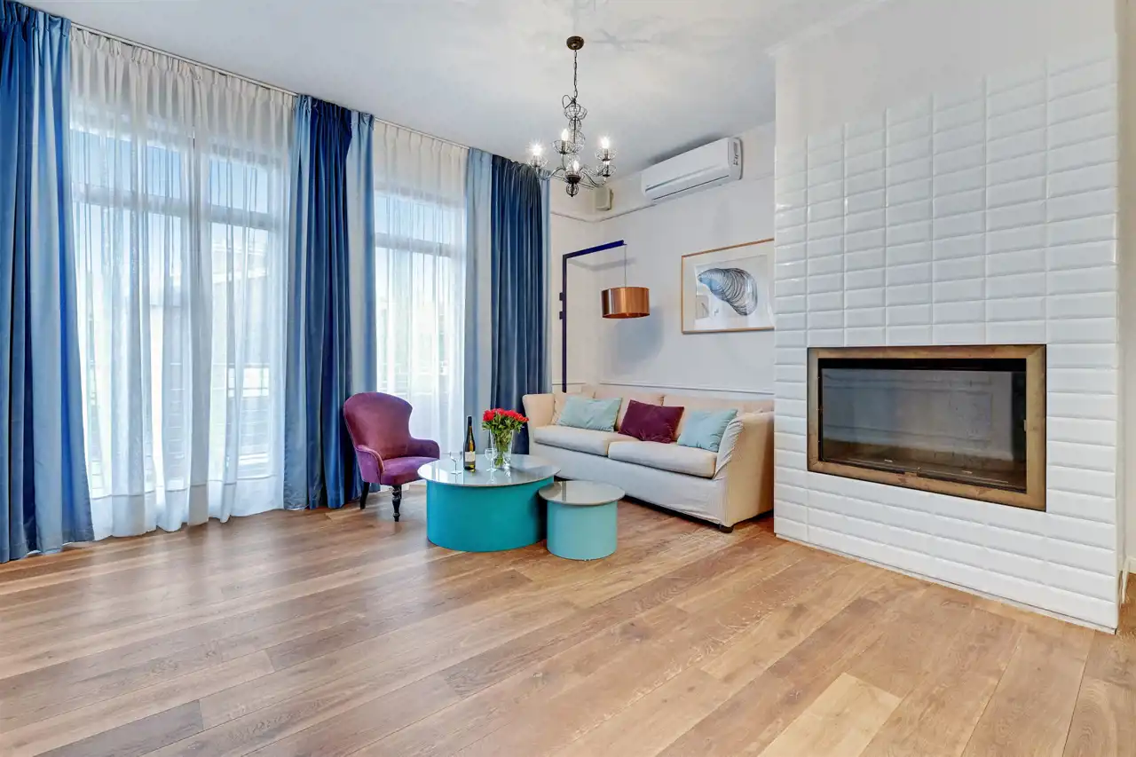 Apartament w pełni umeblowany o wysokim standardzie widocznym na zdjęciach.