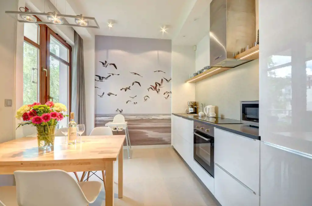 Apartament w pełni umeblowany o wysokim standardzie widocznym na zdjęciach.