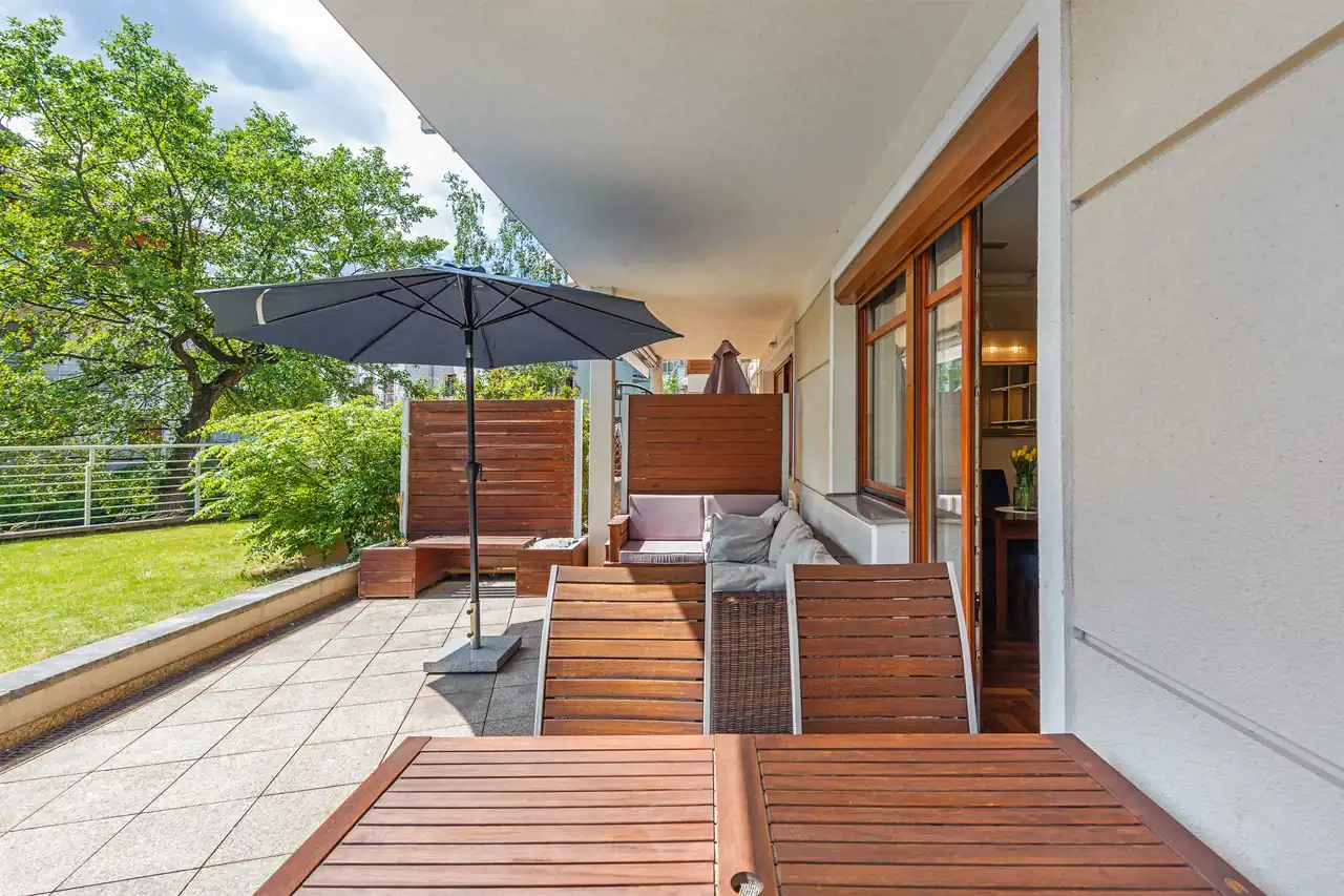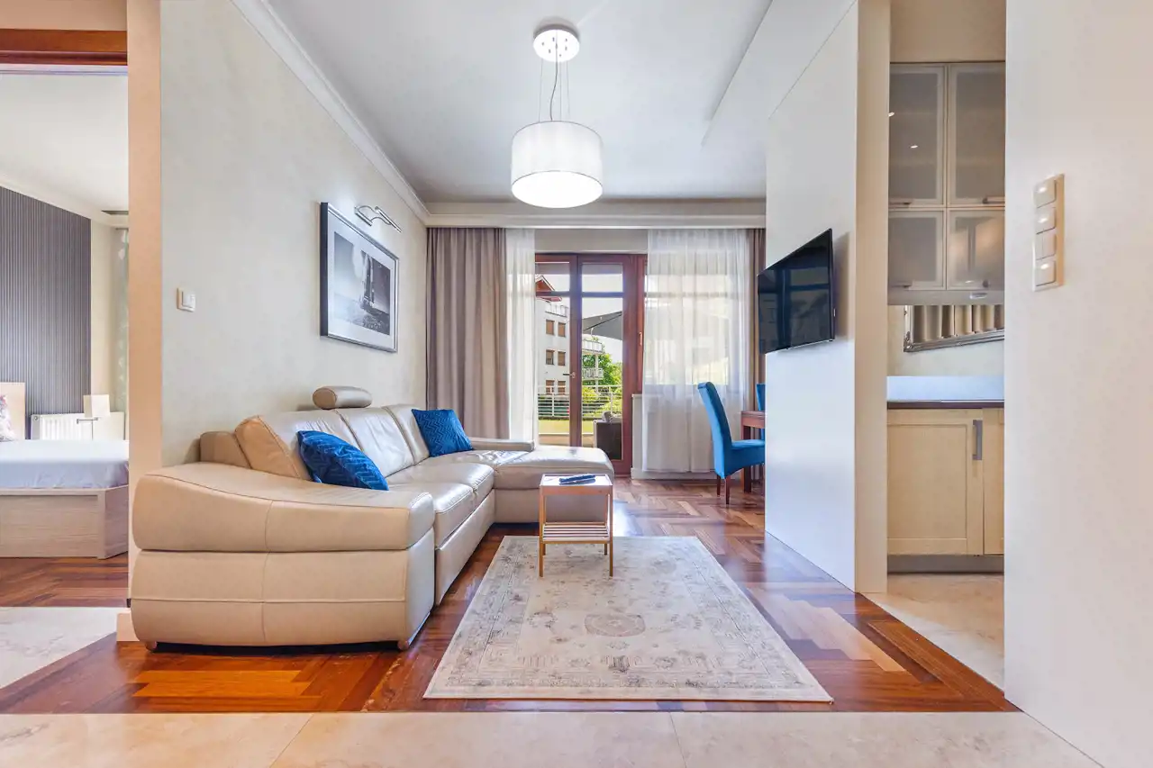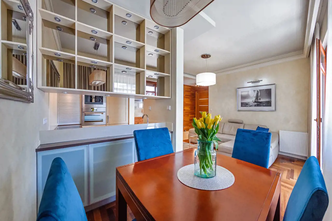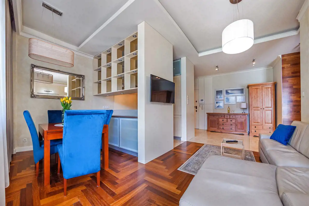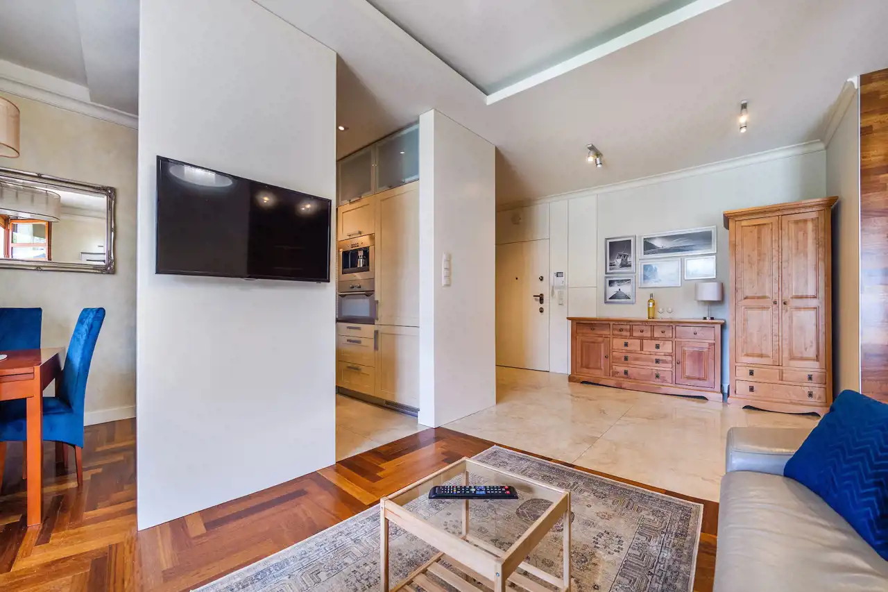 Apartament w pełni umeblowany o wysokim standardzie widocznym na zdjęciach.