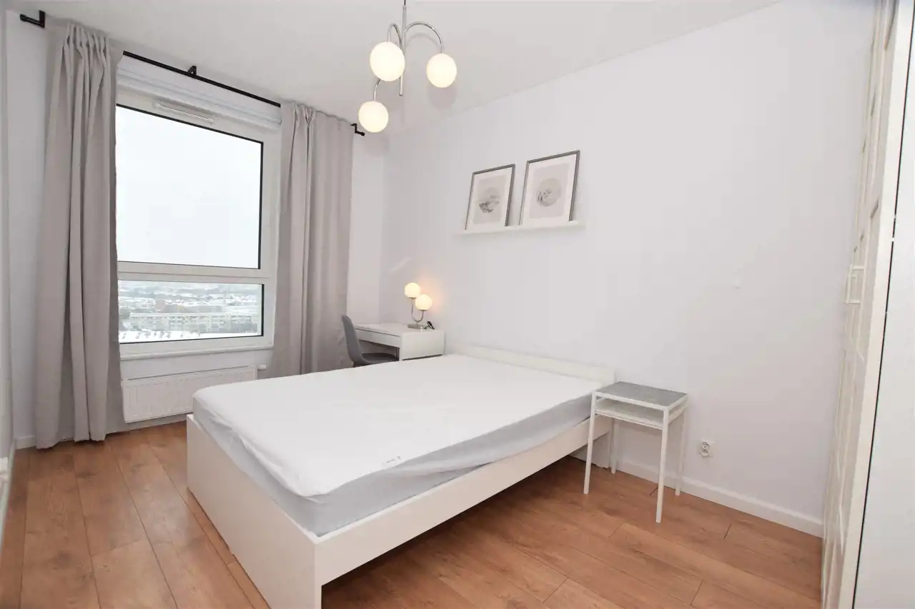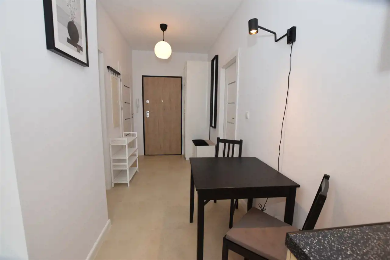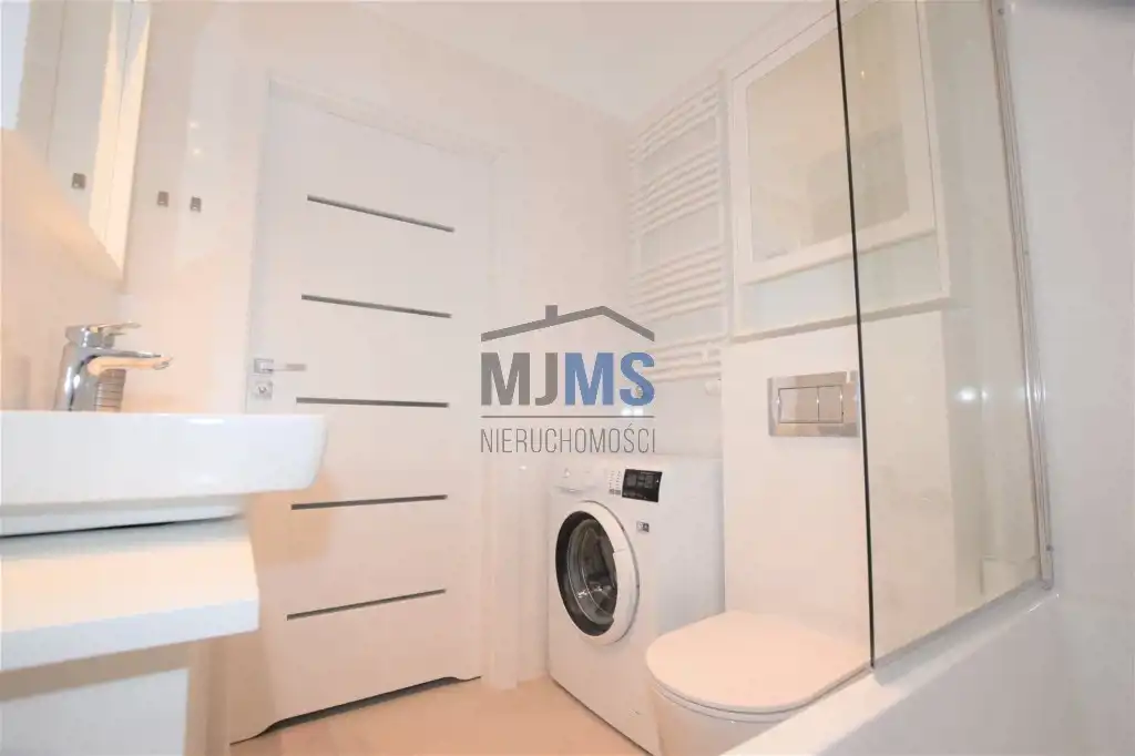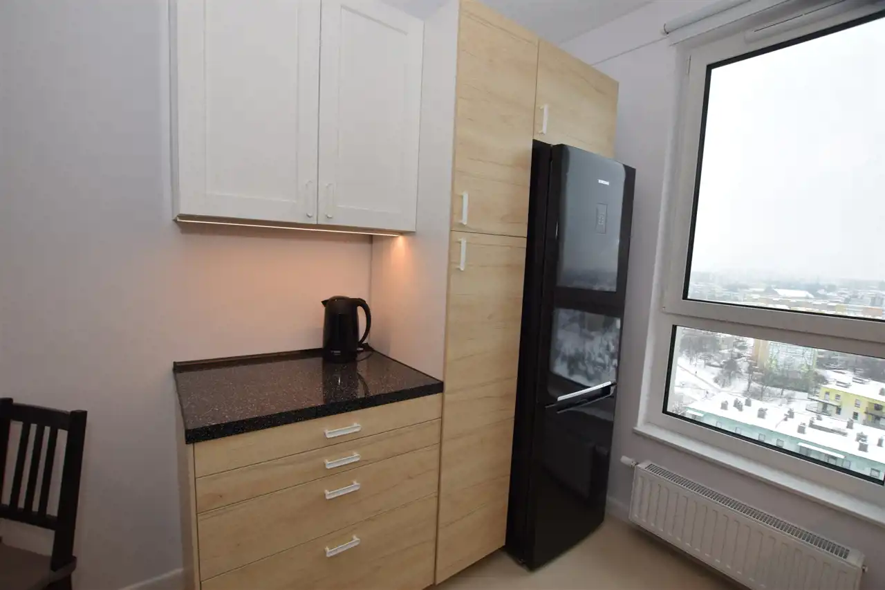 Przedpokój (5,90 m2) z szafą, wieszakami i lustrem. Z przedpokoju wchodzi się do dwóch niezależnych pokoi. Pierwszy z nich który służy jako salon (16,79 m2) - w pełni umeblowany (sofa, stół z krzesłami, stolik, duża szafa, komoda na której znajduje się TV, stojąca lampa, dodatki w postaci obrazów na ścianach) - z którego można wyjść na kameralny balkon z widokiem na osiedle oraz imponującą panoramę miasta. Drugi pokój o powierzchni 12,98 m2 również w pełni umeblowany (sofa, szafa, stolik, komoda, lampka). Dodatkowo do dyspozycji kuchnia (7,62m2) wyposażona w lodówkę, płytę indukcyjną, piekarnik, zmywarkę, stolik wraz z krzesłami oraz łazienka (3,86 m2) z wanną, umywalką, pralką oraz szafkami.
