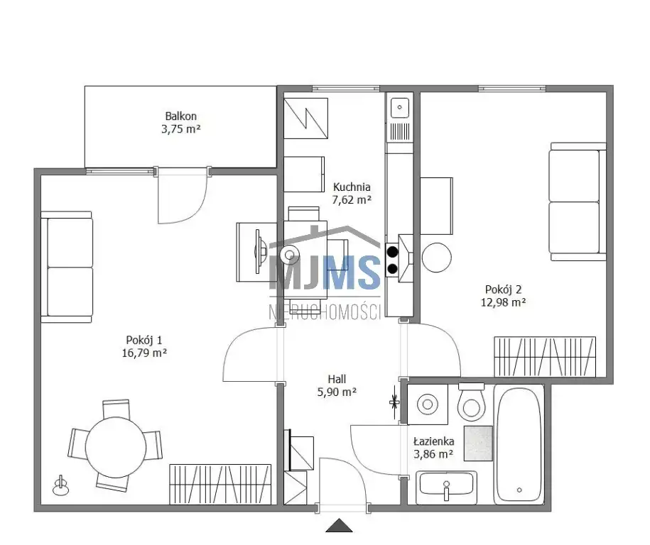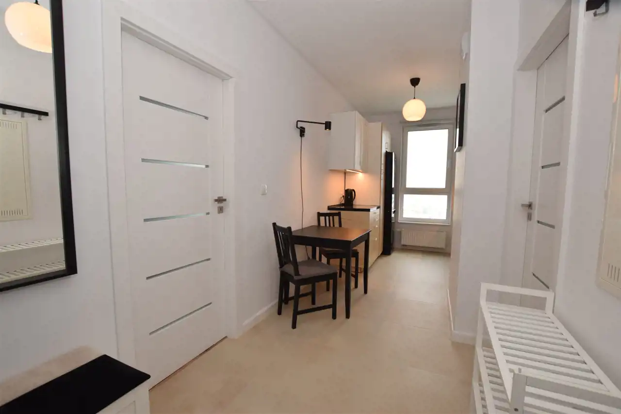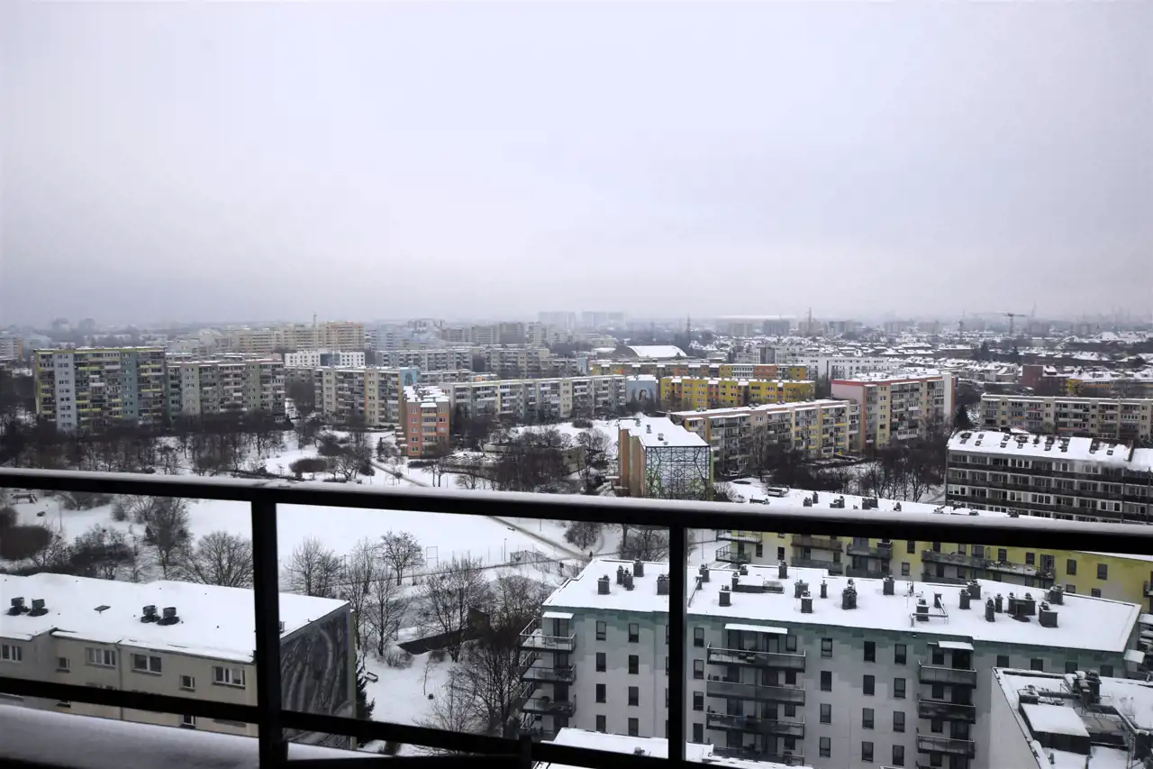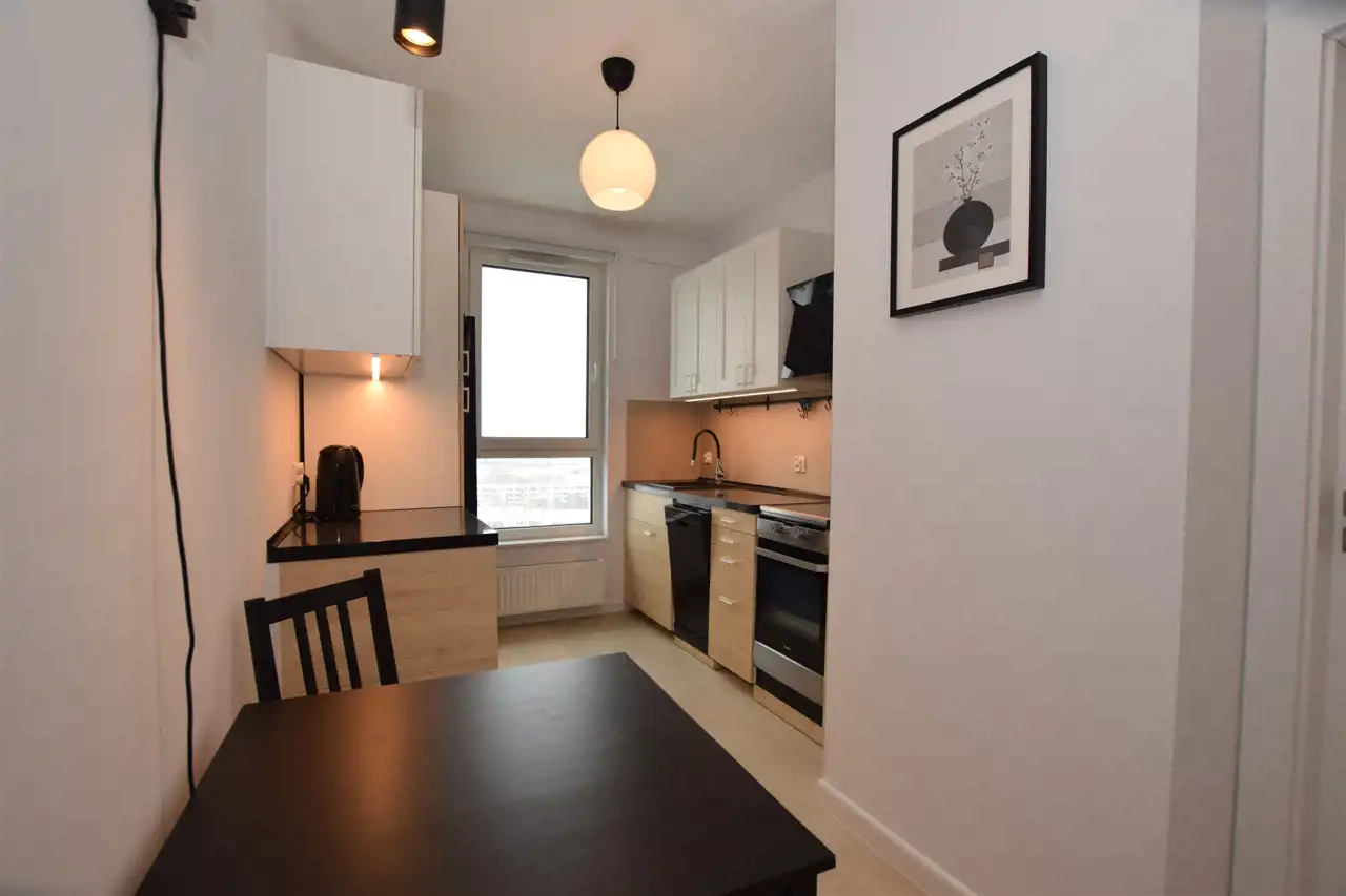 Przedpokój (5,90 m2) z szafą, wieszakami i lustrem. Z przedpokoju wchodzi się do dwóch niezależnych pokoi. Pierwszy z nich który służy jako salon (16,79 m2) - w pełni umeblowany (sofa, stół z krzesłami, stolik, duża szafa, komoda na której znajduje się TV, stojąca lampa, dodatki w postaci obrazów na ścianach) - z którego można wyjść na kameralny balkon z widokiem na osiedle oraz imponującą panoramę miasta. Drugi pokój o powierzchni 12,98 m2 również w pełni umeblowany (sofa, szafa, stolik, komoda, lampka). Dodatkowo do dyspozycji kuchnia (7,62m2) wyposażona w lodówkę, płytę indukcyjną, piekarnik, zmywarkę, stolik wraz z krzesłami oraz łazienka (3,86 m2) z wanną, umywalką, pralką oraz szafkami.