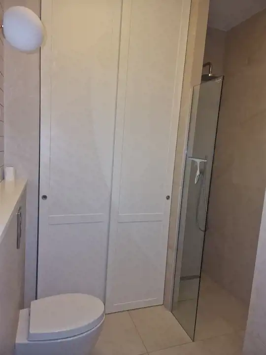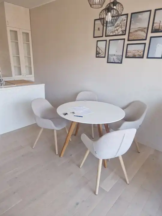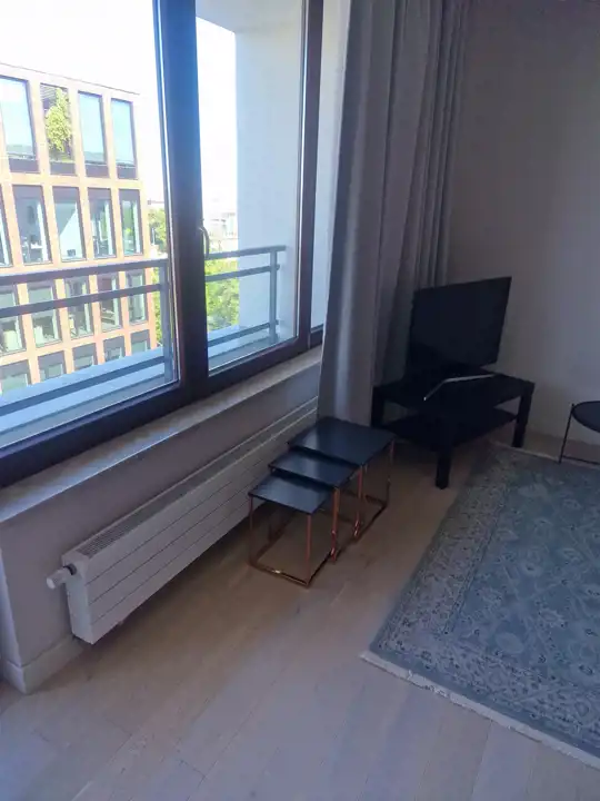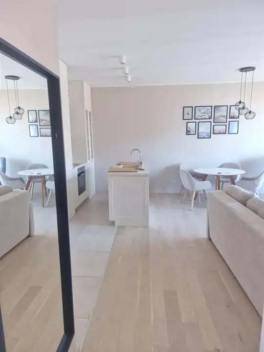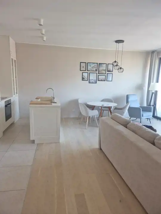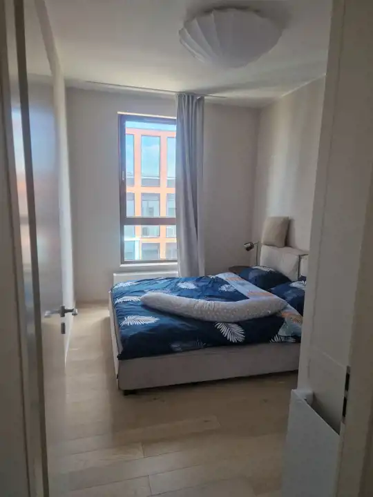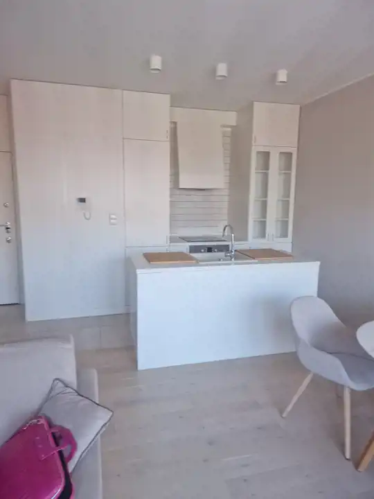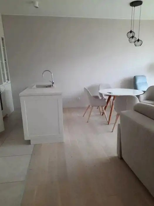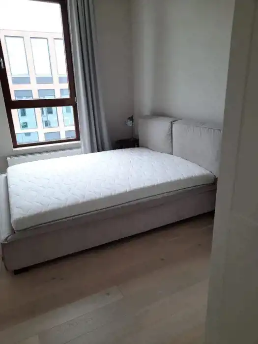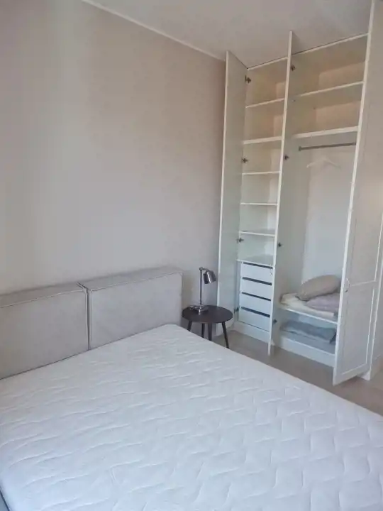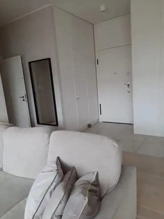 W salonie jest kanapa szara z funkcja spania, fotel, stolik oraz TV . W sypialni znajduje się podwójne łóżko, szafki nocne przy łóżku, pojemna szafa ubraniowa wbudowana . Z salonu można wyjść na balkon .