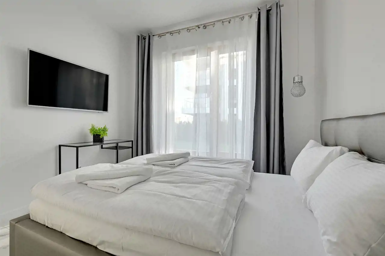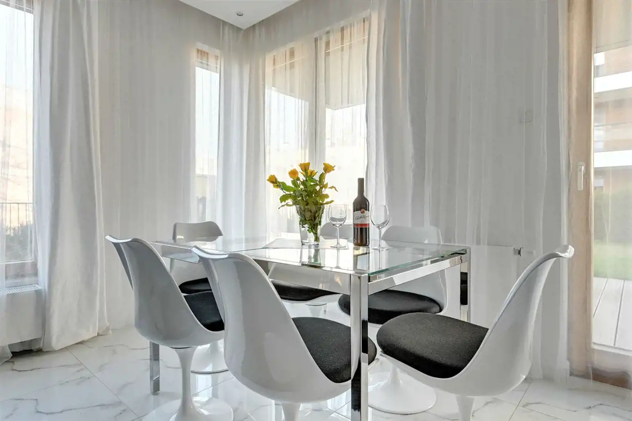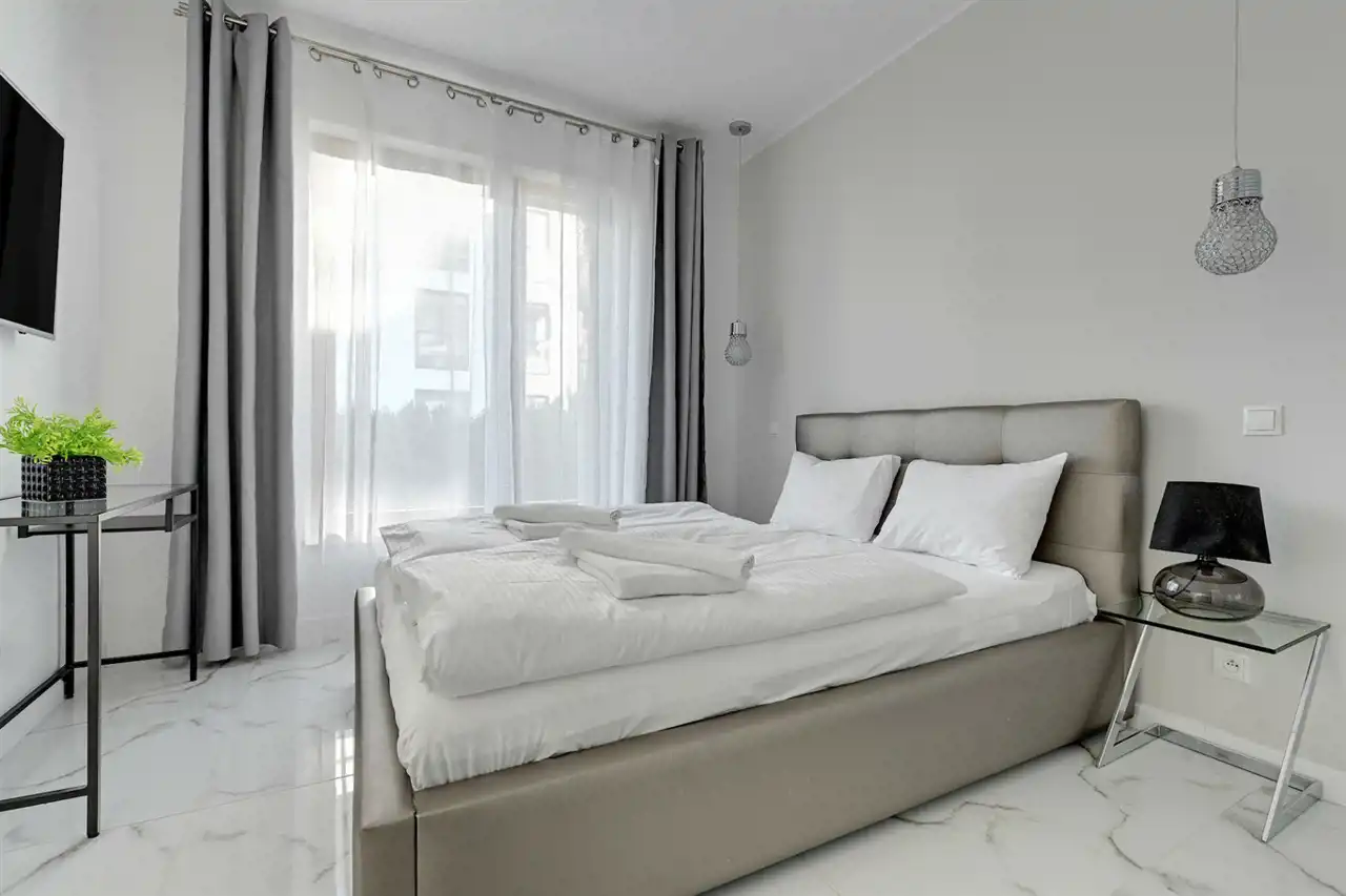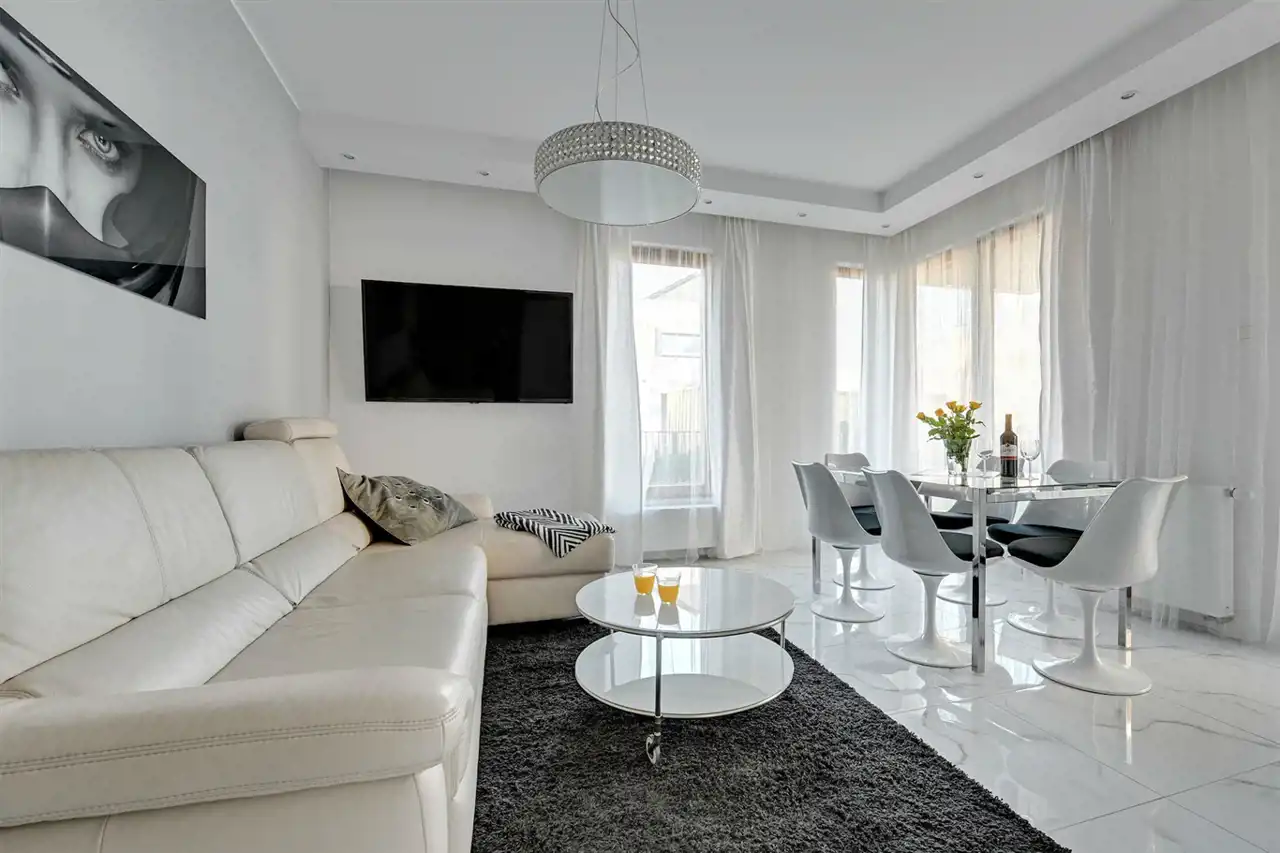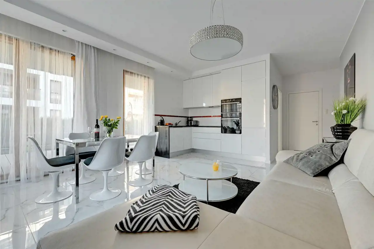 Apartament jest w pełni umeblowany o wysokim standardzie widocznym na zdjęciach.