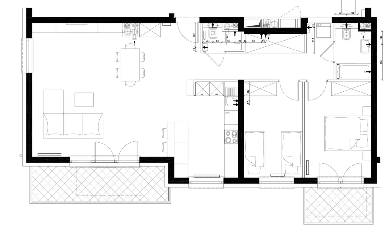 Sypialnia z łóżkiem V-bed (chowane w zabudowę) może stanowić też gabinet do pracy, pokój dziecięcy z łukiem piętrowym (można zmienić na zwykłe), przestronny salon z jadalnią, otwarta kuchnia, garderoba i korytarz użytkowy, 2 osobne łazienki (WC z prysznicem + WC z wanną)