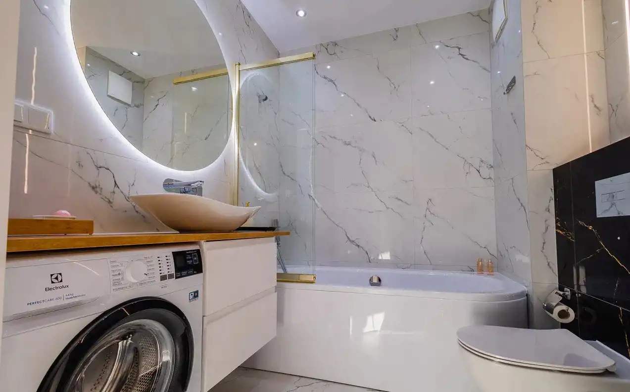 • bardzo duża elegancka łazienka z wanną, WC i bidetem