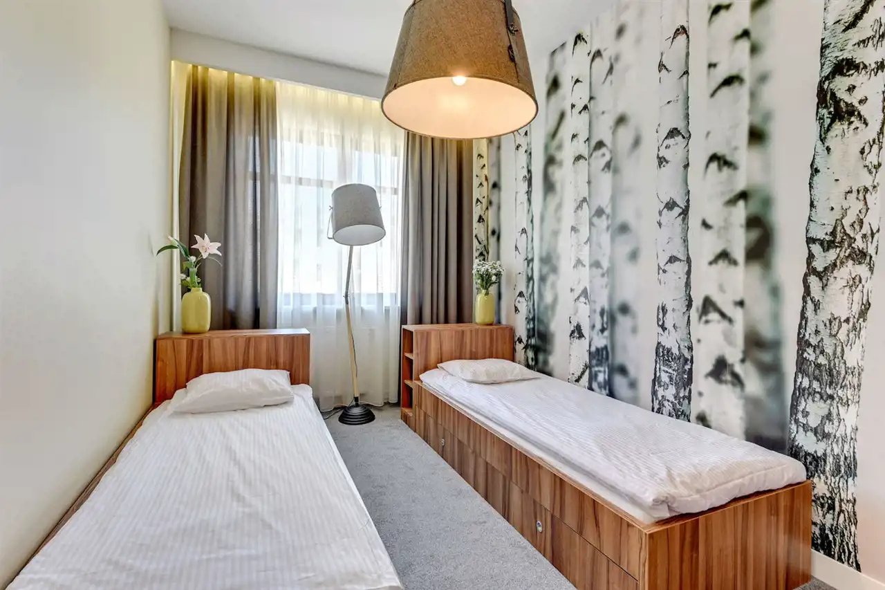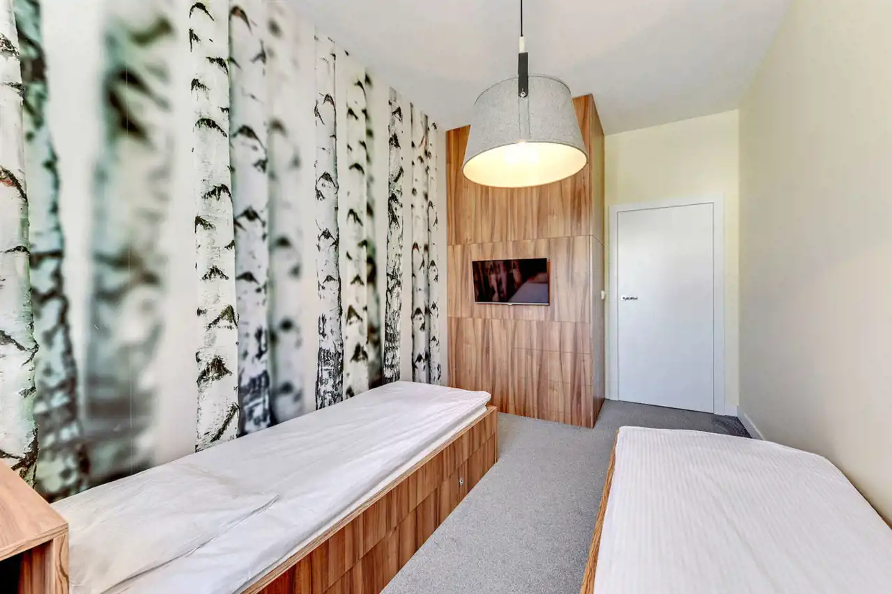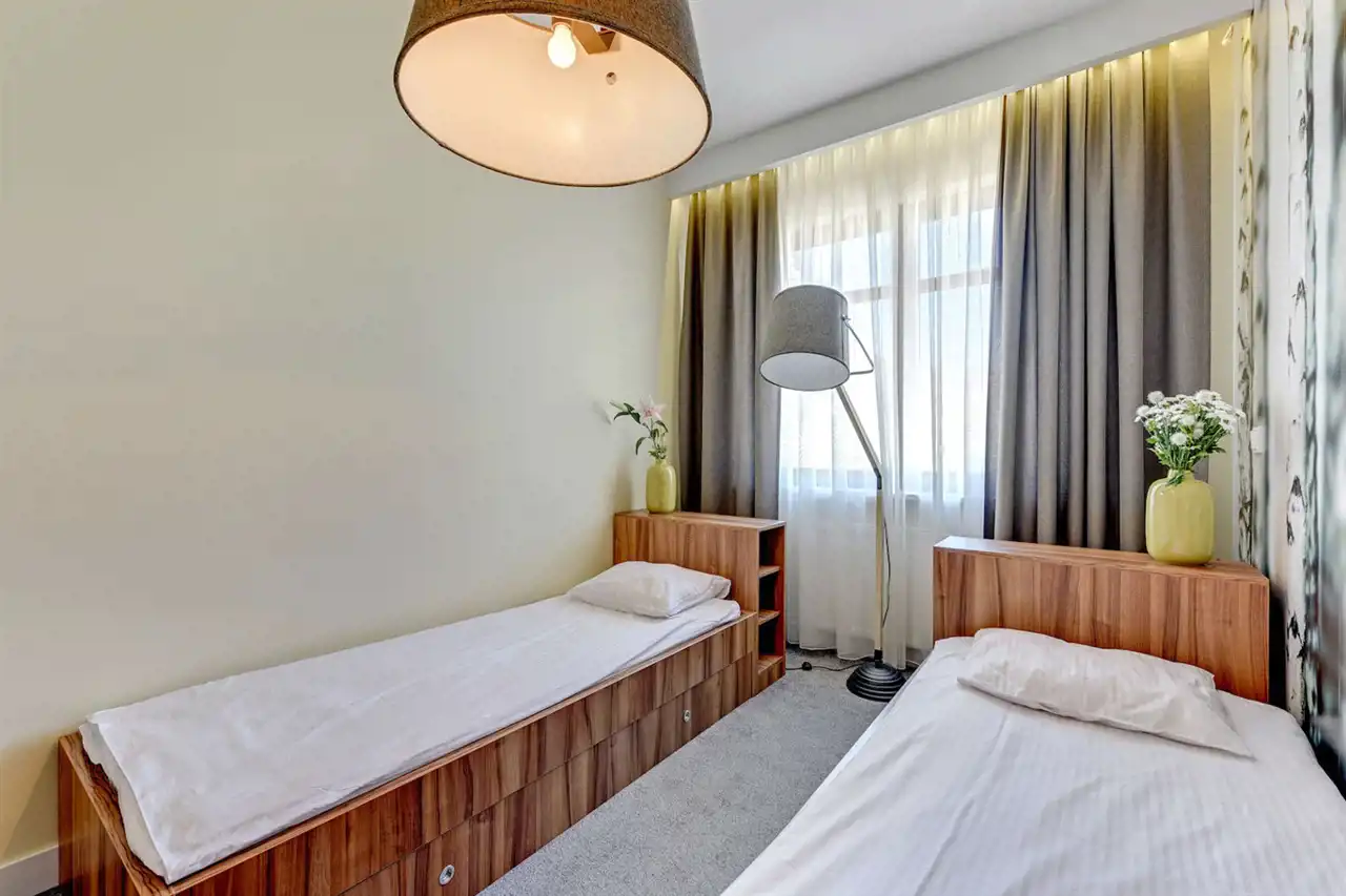 - sypialn II z dwoma łóżkami pojedynczymi oraz wyjściem na taras