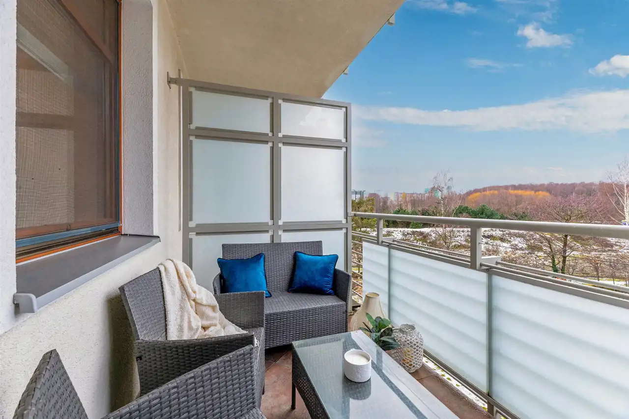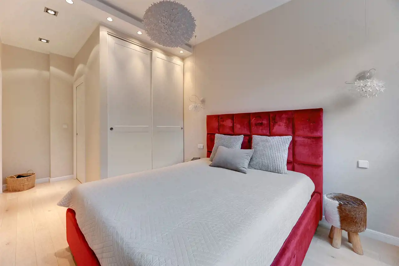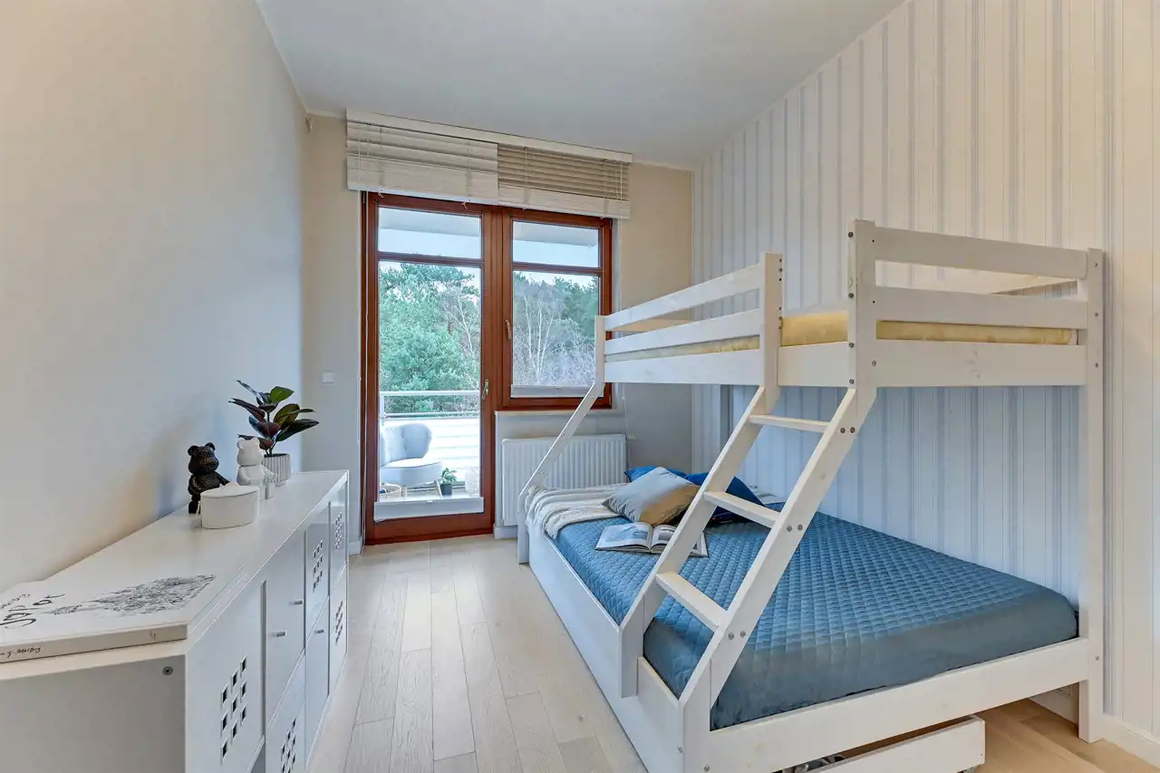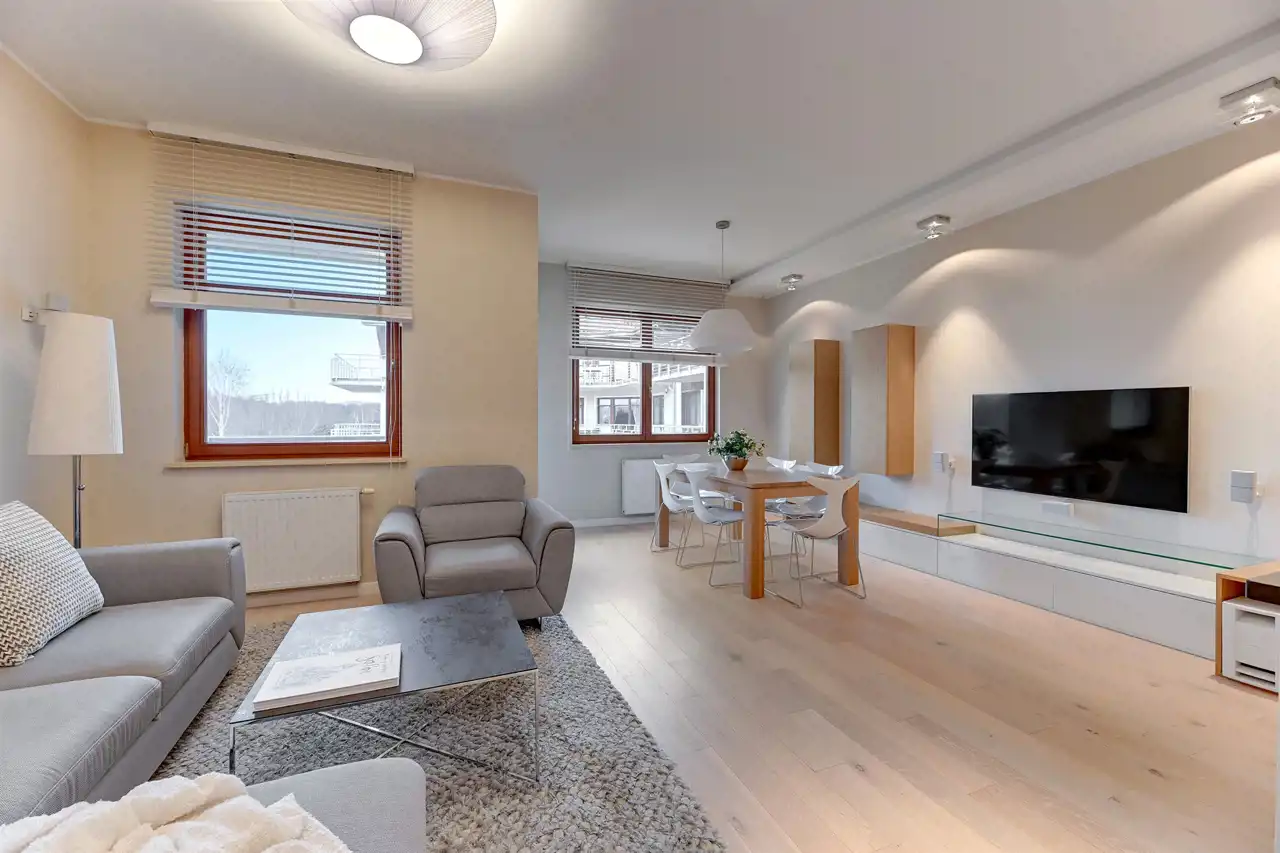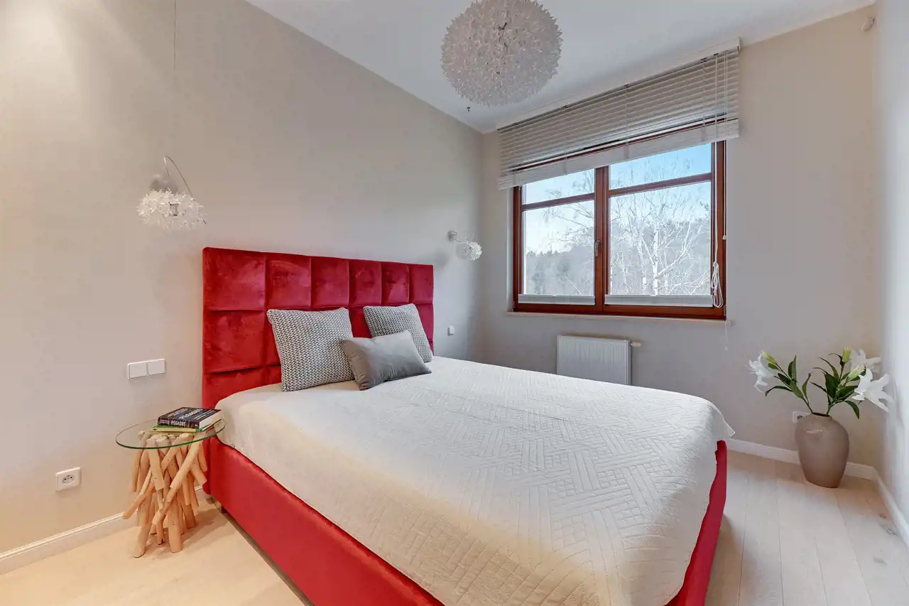 The property is located on the 3rd floor, and with its surface area of 82 m2 includes: living room with kitchenette, two bedrooms, bathroom and hallway. The modernist flat is a combination of modern design with elements of timeless classics. The cohesive décor blends the interior into a spacious, elegant flat. The spacious living room offers a large corner sofa that forms part of the leisure area, a wooden dining table with four chairs and a TV with RTV cabinet. The living room comes with a large furnished balcony overlooking the expansive green treetops. The kitchenette in the alcove has been made to measure and is fully equipped with high quality appliances. The master bedroom consists of a large double bed with scarlet upholstery complimenting the interior and a built-in, capacious wardrobe giving ample storage space. The second bedroom is fitted with a bunk bed and can serve as both a guest bedroom and a practical study. Bathed in fashionable grey, the bathroom provides a spacious walk-in shower, washbasin with cupboard and toilet.