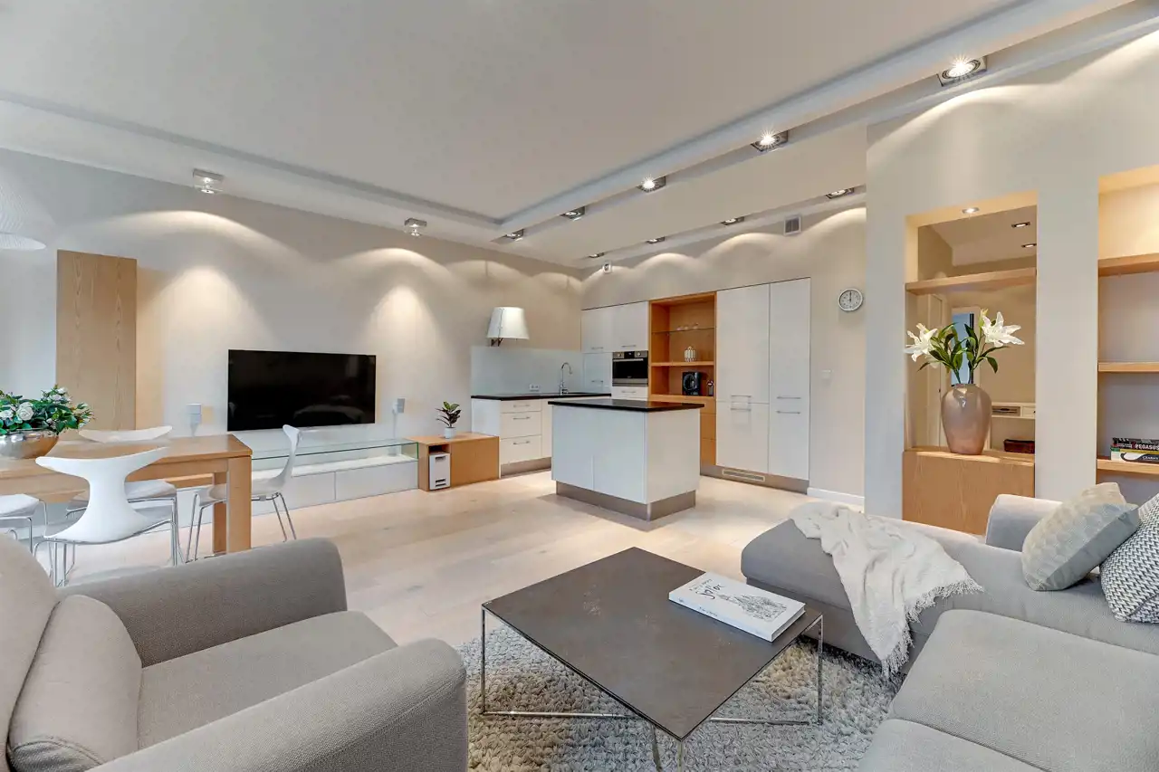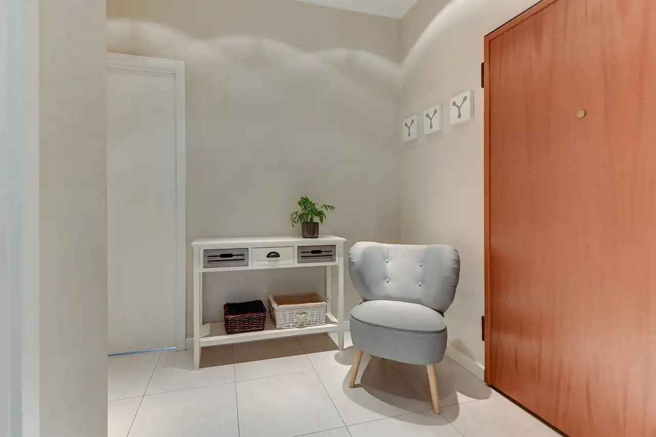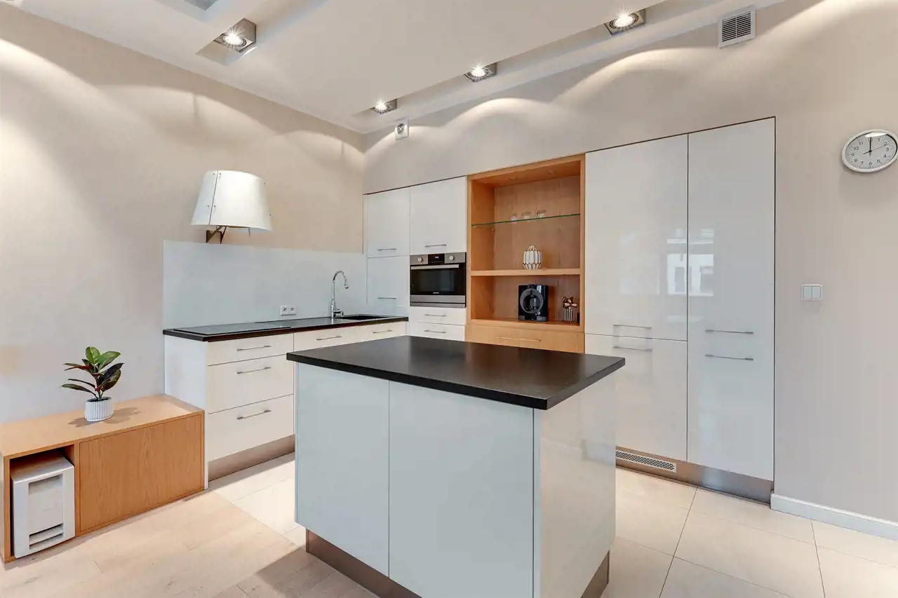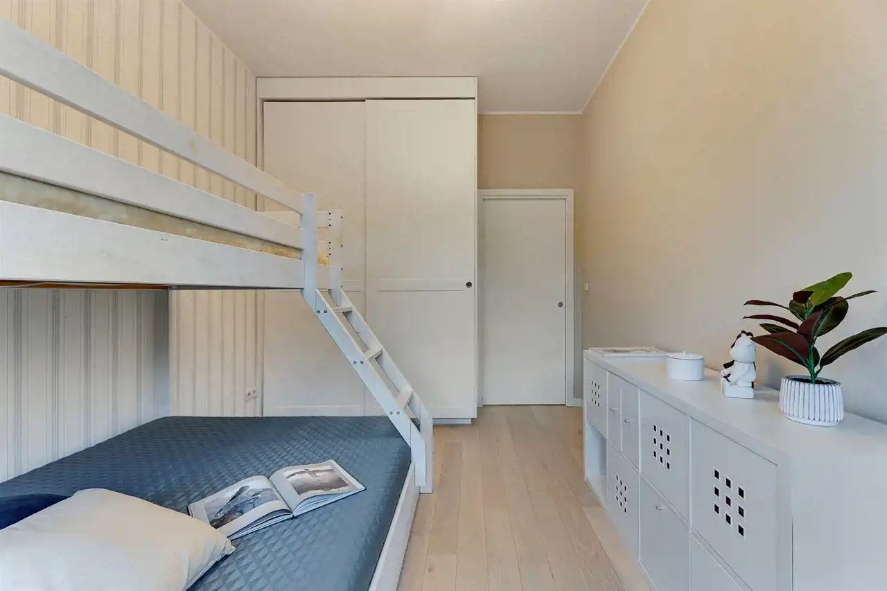 The property is located on the 3rd floor, and with its surface area of 82 m2 includes: living room with kitchenette, two bedrooms, bathroom and hallway. The modernist flat is a combination of modern design with elements of timeless classics. The cohesive décor blends the interior into a spacious, elegant flat. The spacious living room offers a large corner sofa that forms part of the leisure area, a wooden dining table with four chairs and a TV with RTV cabinet. The living room comes with a large furnished balcony overlooking the expansive green treetops. The kitchenette in the alcove has been made to measure and is fully equipped with high quality appliances. The master bedroom consists of a large double bed with scarlet upholstery complimenting the interior and a built-in, capacious wardrobe giving ample storage space. The second bedroom is fitted with a bunk bed and can serve as both a guest bedroom and a practical study. Bathed in fashionable grey, the bathroom provides a spacious walk-in shower, washbasin with cupboard and toilet.