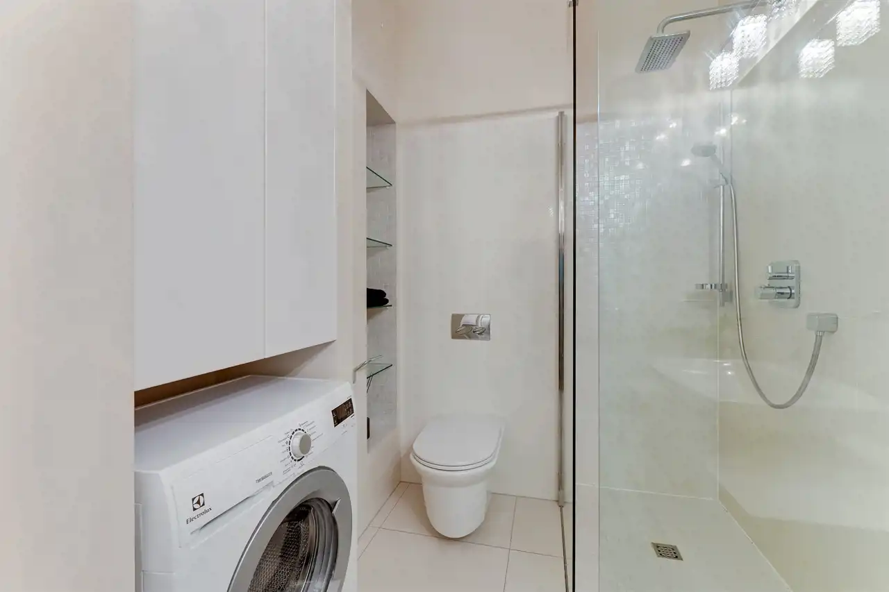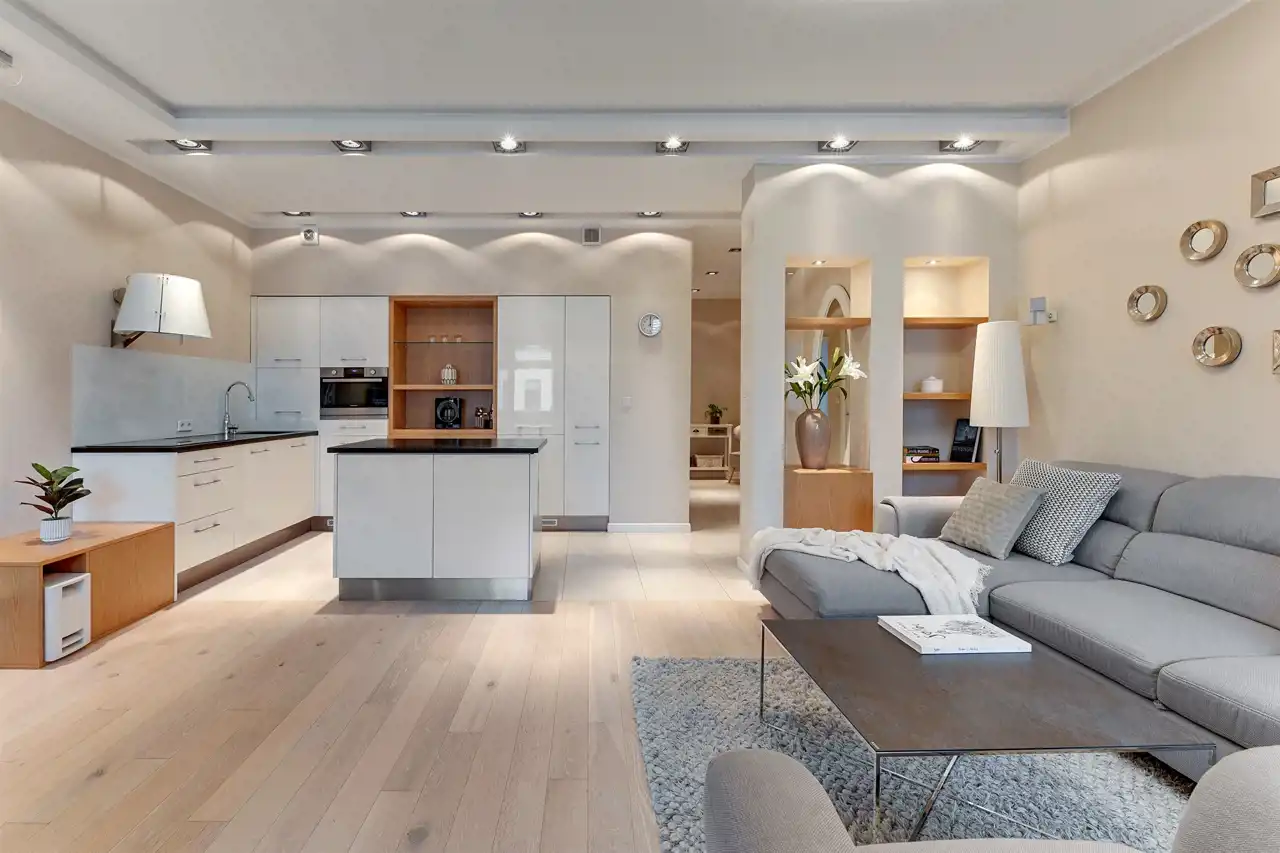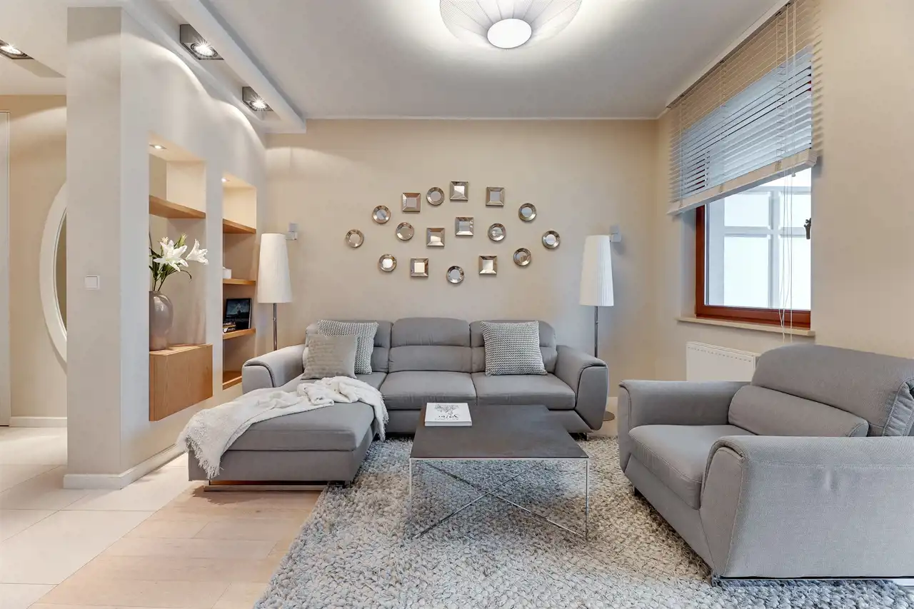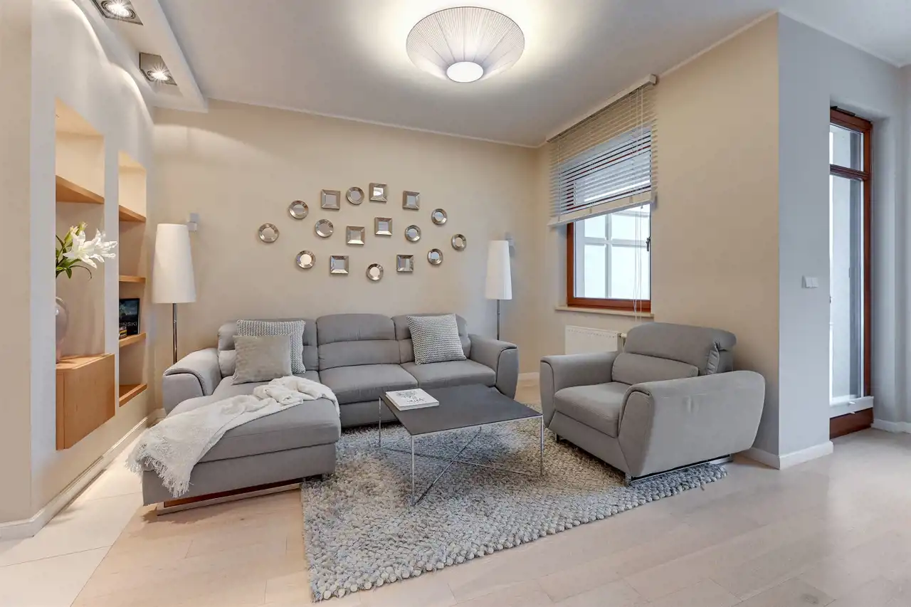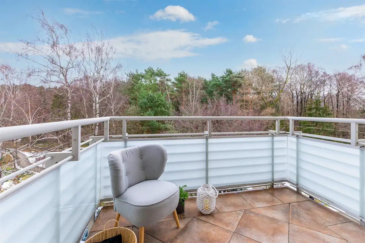 The property is located on the 3rd floor, and with its surface area of 82 m2 includes: living room with kitchenette, two bedrooms, bathroom and hallway. The modernist flat is a combination of modern design with elements of timeless classics. The cohesive décor blends the interior into a spacious, elegant flat. The spacious living room offers a large corner sofa that forms part of the leisure area, a wooden dining table with four chairs and a TV with RTV cabinet. The living room comes with a large furnished balcony overlooking the expansive green treetops. The kitchenette in the alcove has been made to measure and is fully equipped with high quality appliances. The master bedroom consists of a large double bed with scarlet upholstery complimenting the interior and a built-in, capacious wardrobe giving ample storage space. The second bedroom is fitted with a bunk bed and can serve as both a guest bedroom and a practical study. Bathed in fashionable grey, the bathroom provides a spacious walk-in shower, washbasin with cupboard and toilet.