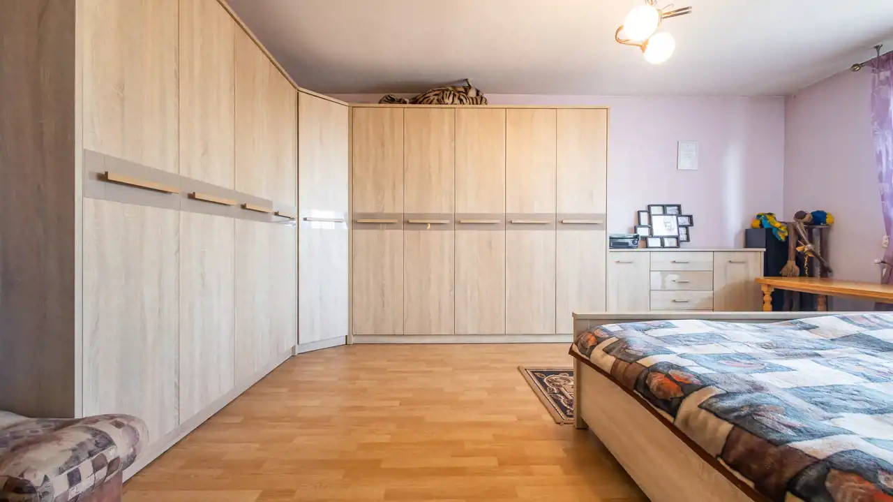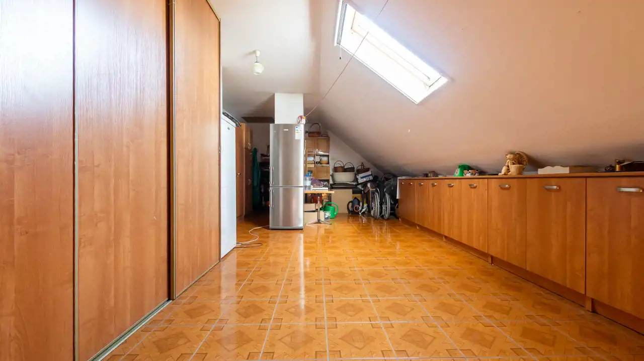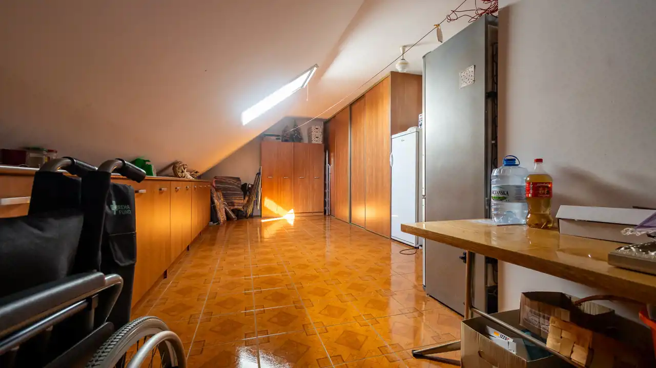 W domu liczna zabudowa na wymiar. Podłogi drewniane, w górnej części domu panele.