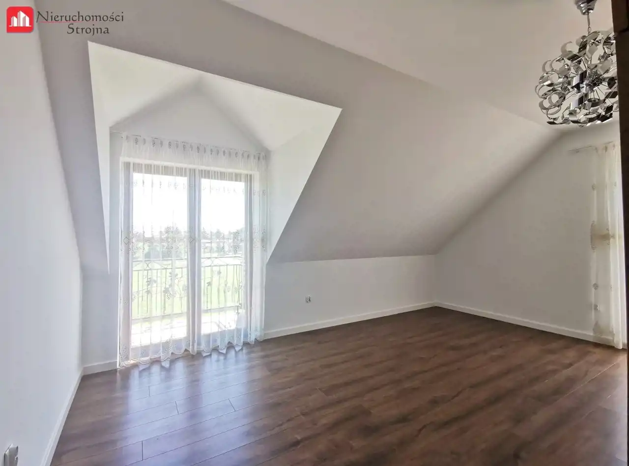 Kuchnia umeblowana wraz ze sprzętem AGD. Na parterze na podłogach płytki, w sypialni panele. Schody podświetlane dębowe. Na poddaszu na podłogach panele.