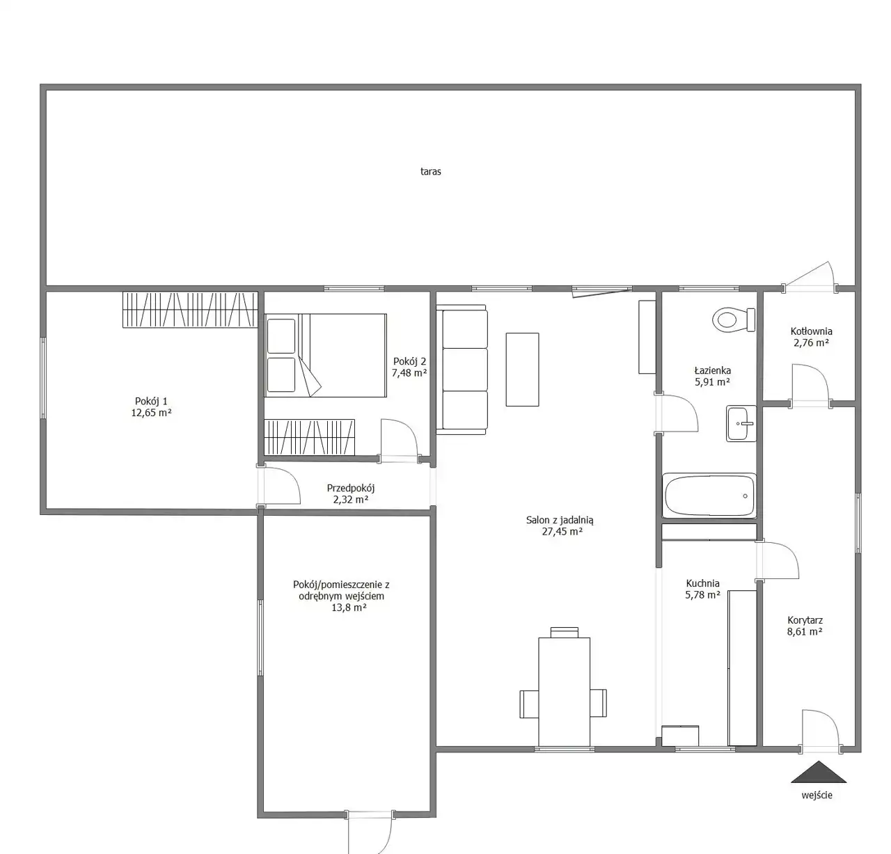 W budynku znajduje się korytarz, kotłownia, dwa pokoje, salon z jadalnią z wyjściem na duży taras, kuchnia, łazienka, przedpokój oraz dodatkowe pomieszczenie z osobnym wejściem.