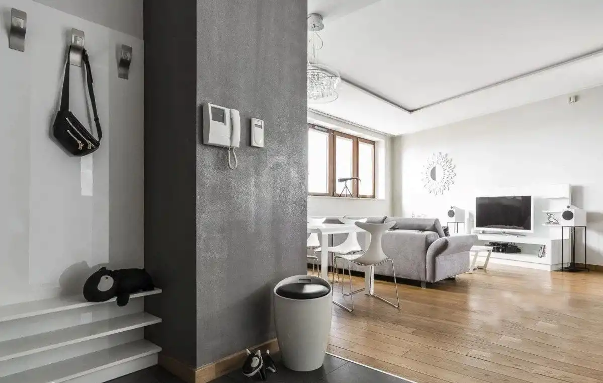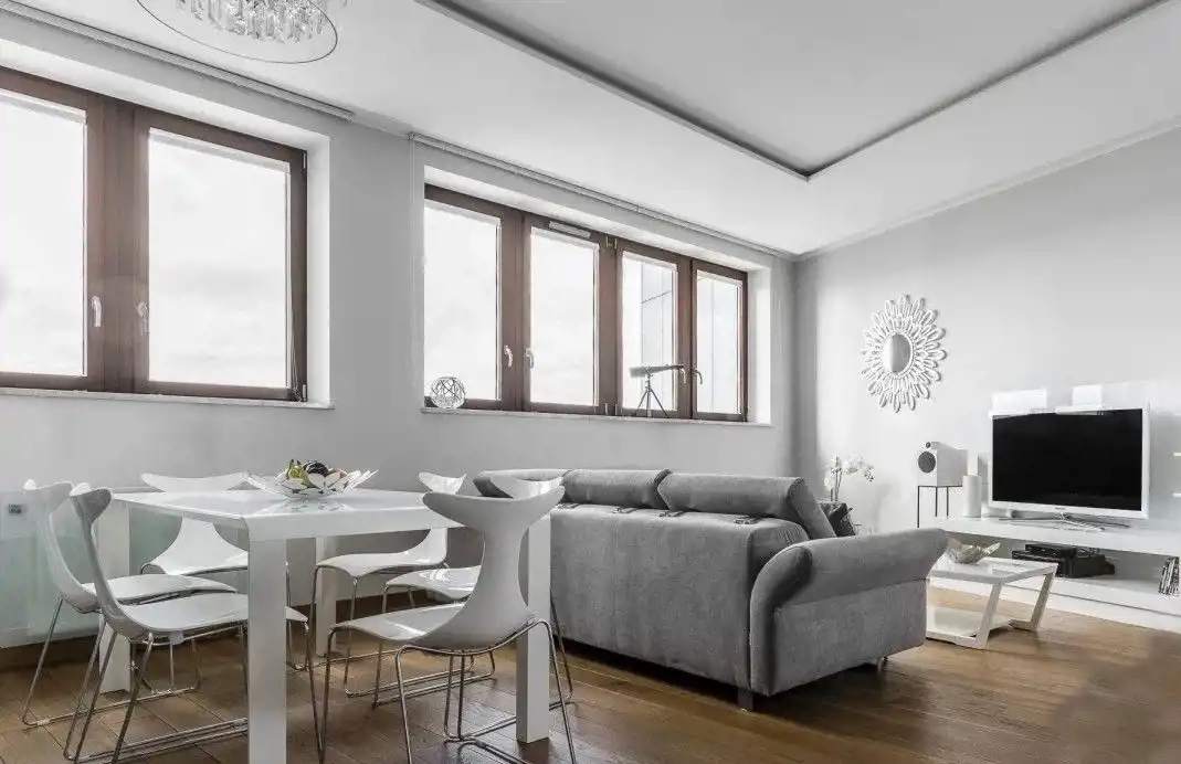 Apartament znajduje się na 18 piętrze (XXII kondygnacji), a swoją powierzchnią 84 m2 obejmuje: salon z aneksem kuchennym, sypialnię z garderobą, łazienkę, wc oraz przedpokój. Mieszkanie zostało zaaranżowane w stonowanej kolaboracji szarości i bieli, które podkreślają wytworny wystrój wnętrza. Niezwykle przestronny pokój dzienny łączy w sobie część rekreacyjną oraz jadalnianą. Stoicki, monochromatyczny styl mebli zjawiskowo kontrastuje z ciepłą tonacją drewnianej podłogi, a modernistyczne wyposażenie zwieńczone wyszukanymi dodatkami pozwala cieszyć zmysły estetyczne przy maksymalnym komforcie. Aneks kuchenny z wyspą i dużą, dwuskrzydłową lodówką jest urządzony tak, by w pełni wykorzystać dostępną powierzchnię. W sypialni, tak jak w reszcie lokalu, postawiono na stonowaną kolorystykę. Dla ocieplenia intymnego wnętrza wkomponowano dodatki w odcieniach głębokiego fioletu, dodając mu zmysłowej tonacji. Do pokoju sypialnianego przynależy obszerna garderoba. Nowoczesna łazienka zawiera w sobie elementy chłodnej, ciosanej szarości, a kwiatowe akcenty niwelują chłód kamienia, nadając jej przytulnej atmosfery. W apartamencie odnajdą się przede wszystkim osoby szukające wygody, przestrzeni i nowoczesnych rozwiązań architektonicznych, mimo to nie chcący zrezygnować z ciepła domowego zacisza.