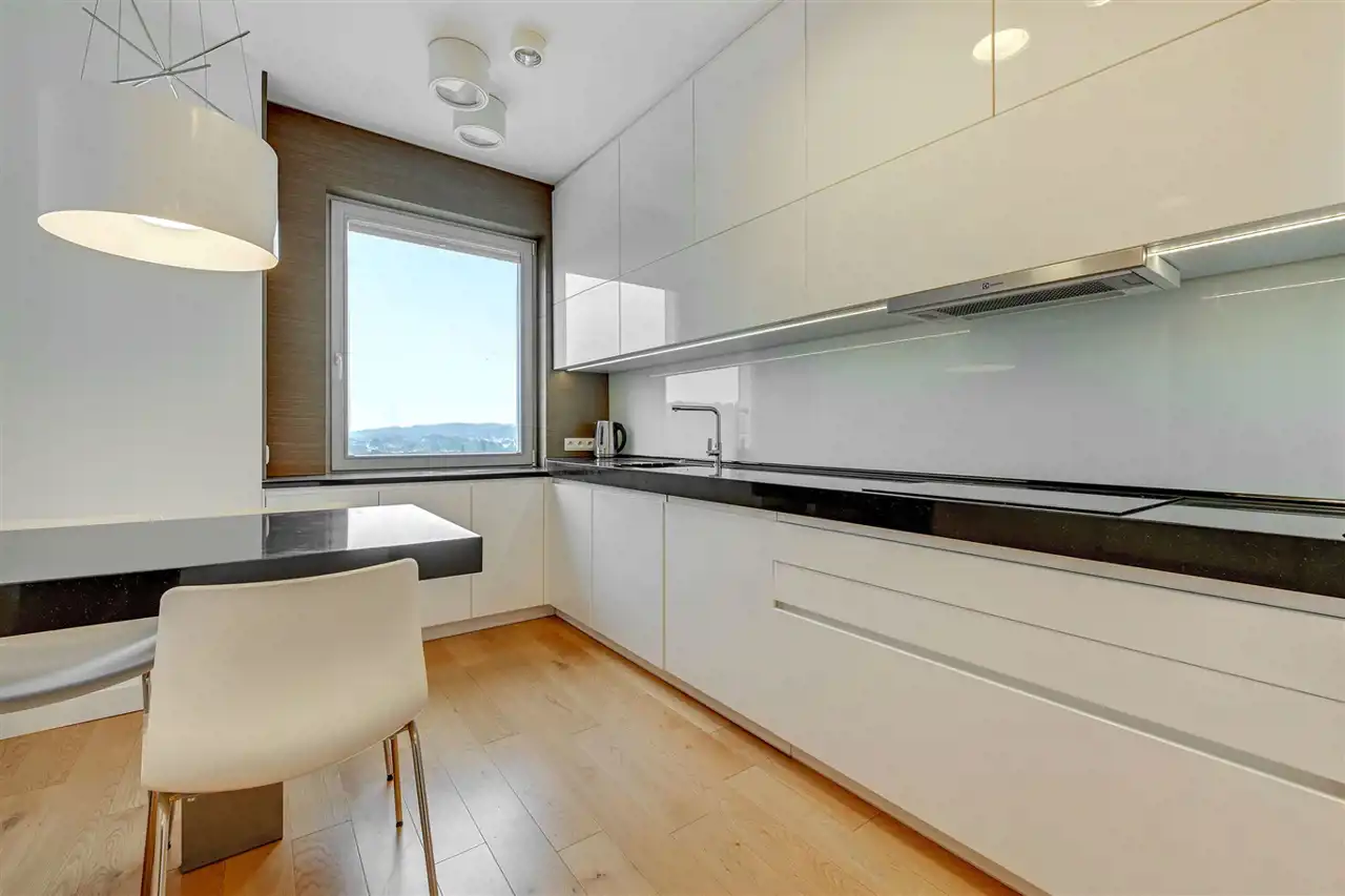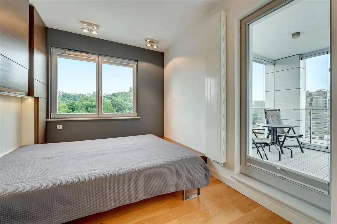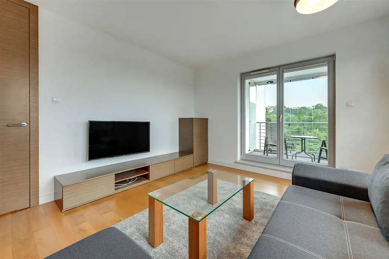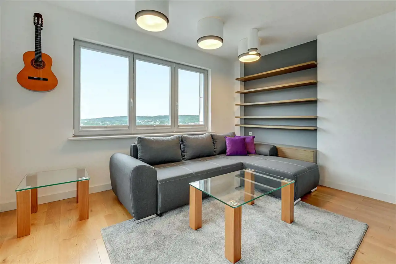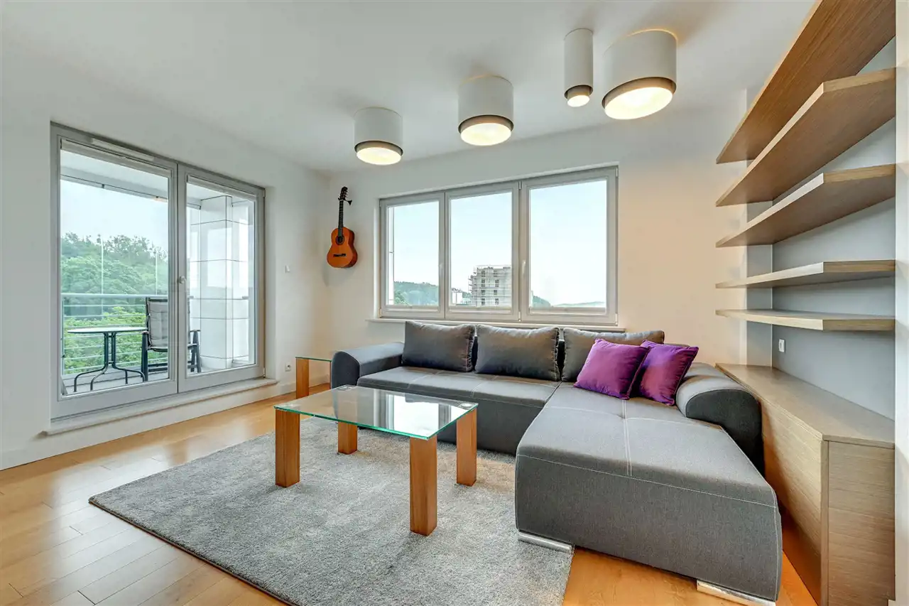 W pełni wyposażone mieszkanie jest położone na piątym piętrze. Mieszkanie składa się z dwóch pokoi, osobnej kuchni, łazienki, przedpokoju, pomieszczenia gospodarczego z pralką oraz oszklonego tarasu o powierzchni 9m2. Kuchnia w zabudowie, jest w pełni wyposażona w sprzęt AGD - lodówka, płyta grzewcza, piekarnik, okap, zlew, zmywarka. W części wypoczynkowej jest narożna sofa, stolik kawowy oraz telewizor i półka pod sprzęt RTV.