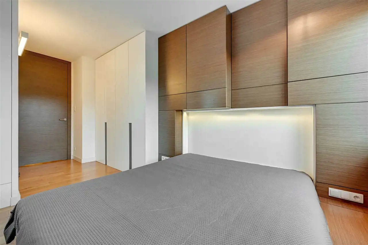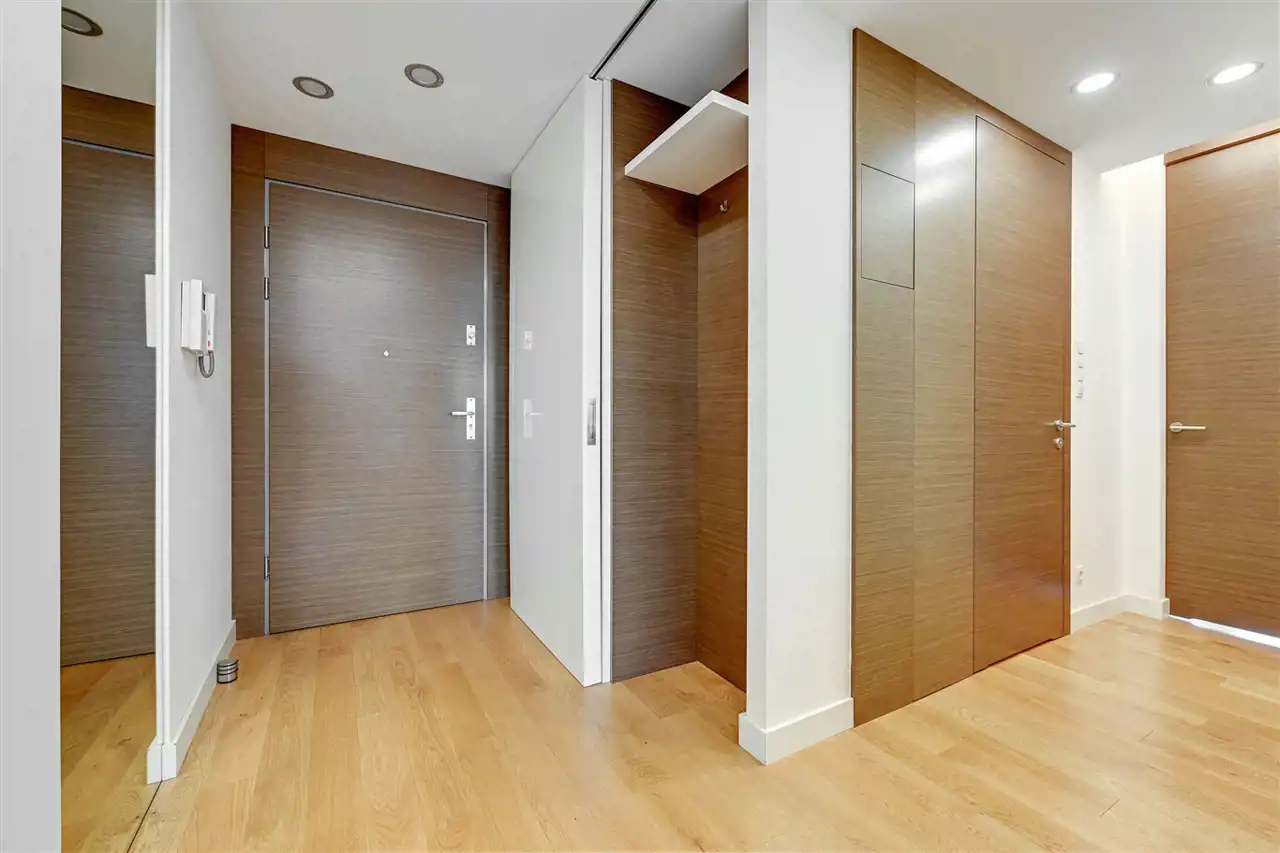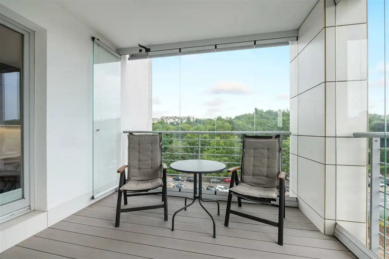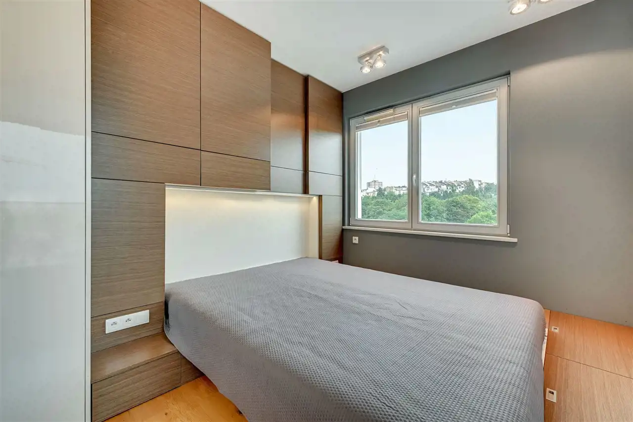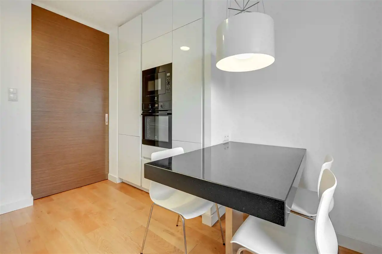 W pełni wyposażone mieszkanie jest położone na piątym piętrze. Mieszkanie składa się z dwóch pokoi, osobnej kuchni, łazienki, przedpokoju, pomieszczenia gospodarczego z pralką oraz oszklonego tarasu o powierzchni 9m2. Kuchnia w zabudowie, jest w pełni wyposażona w sprzęt AGD - lodówka, płyta grzewcza, piekarnik, okap, zlew, zmywarka. W części wypoczynkowej jest narożna sofa, stolik kawowy oraz telewizor i półka pod sprzęt RTV.