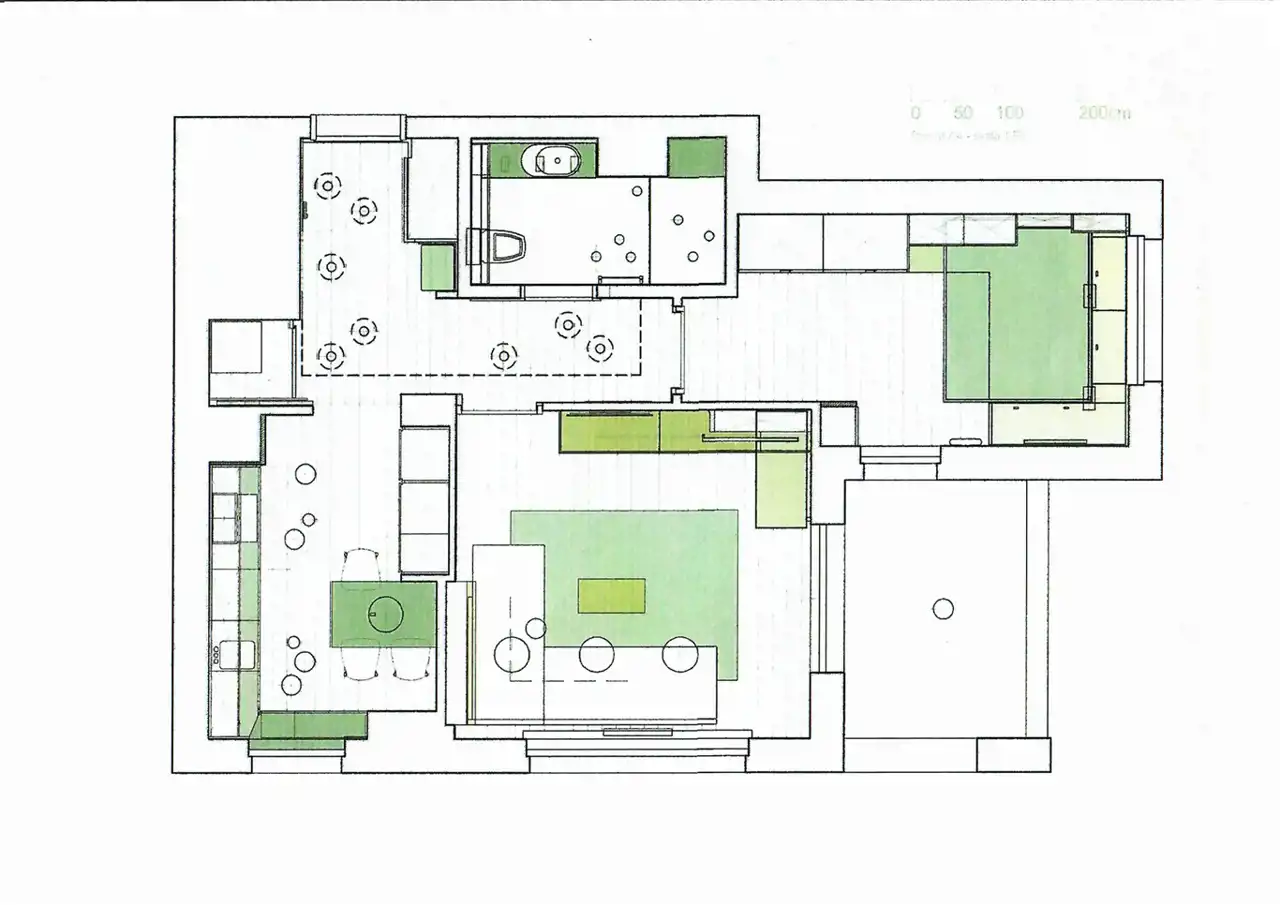 Istnieje możliwość usunięcia ściany dzielącej kuchnię i salon, aby powiększyć przestrzeń i zaaranżować salon z aneksem kuchennym.