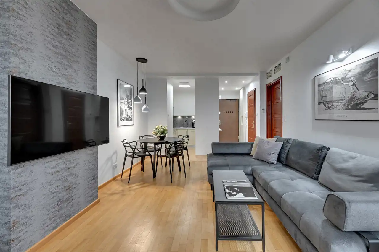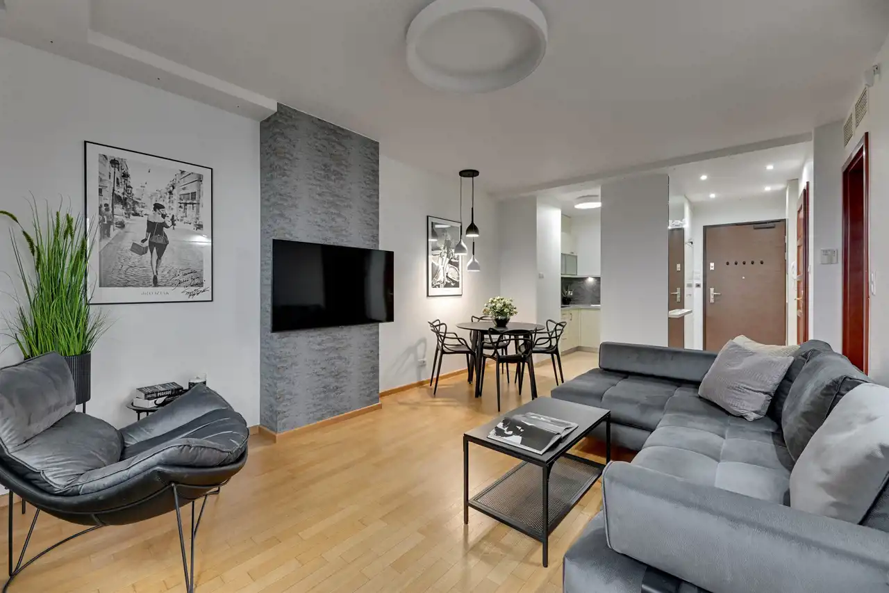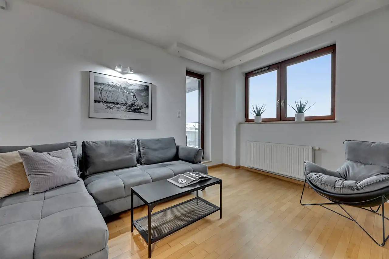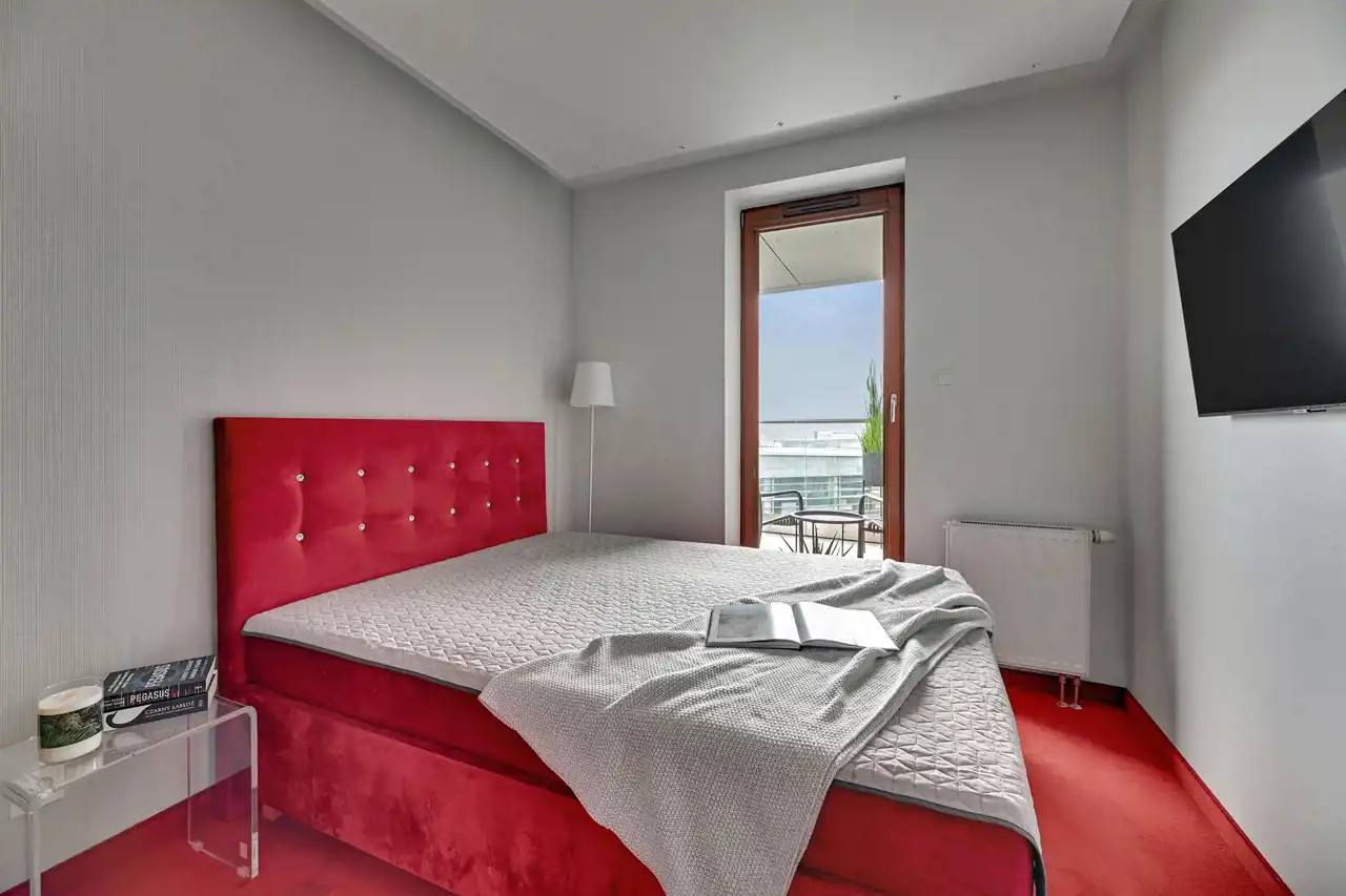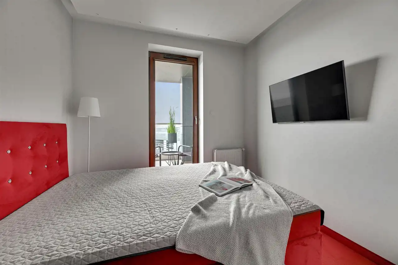 Dwupokojowy apartament zlokalizowany jest na drugim piętrze (VI kondygnacji) kultowego budynku Sea Towers. Nieruchomość składa się z salonu z aneksem kuchennym, sypialni, łazienki, toalety oraz przedpokoju. Z okien oraz przyległego do mieszkania balkonu rozpościera się wspaniały widok na błękit morza. Wyjścia na relaksujący balkon znajdują się zarówno w sypialni jak i w pokoju dziennym. Apartament jest odnowiony, w pełni wyposażony w niezbędny sprzęt i meble. Salon oferuje miejsce do odpoczynku z rogową sofą i dużym telewizorem, jak i część jadalnianą wyposażoną w okrągły stół i cztery krzesła w komplecie. Aneks kuchenny, nieco oddzielony od pokoju dziennego, zapewnia wygodne miejsce przygotowywania posiłków. Sypialnia jest kolorystycznym smaczkiem, wyrywając się przed stonowane barwy wnętrza. Oferuje duże, małżeńskie łóżko z miękkim zagłówkiem, szafę oraz telewizor. Łazienka w ponadczasowych beżach wyposażona jest w wannę i pralkę. Apartament jest przytulny, modny i funkcjonalny, idealny dla nowoczesnego singla lub pary, poszukującego lokum w doskonałej lokalizacji Trójmiasta.
